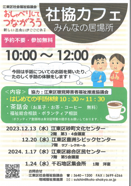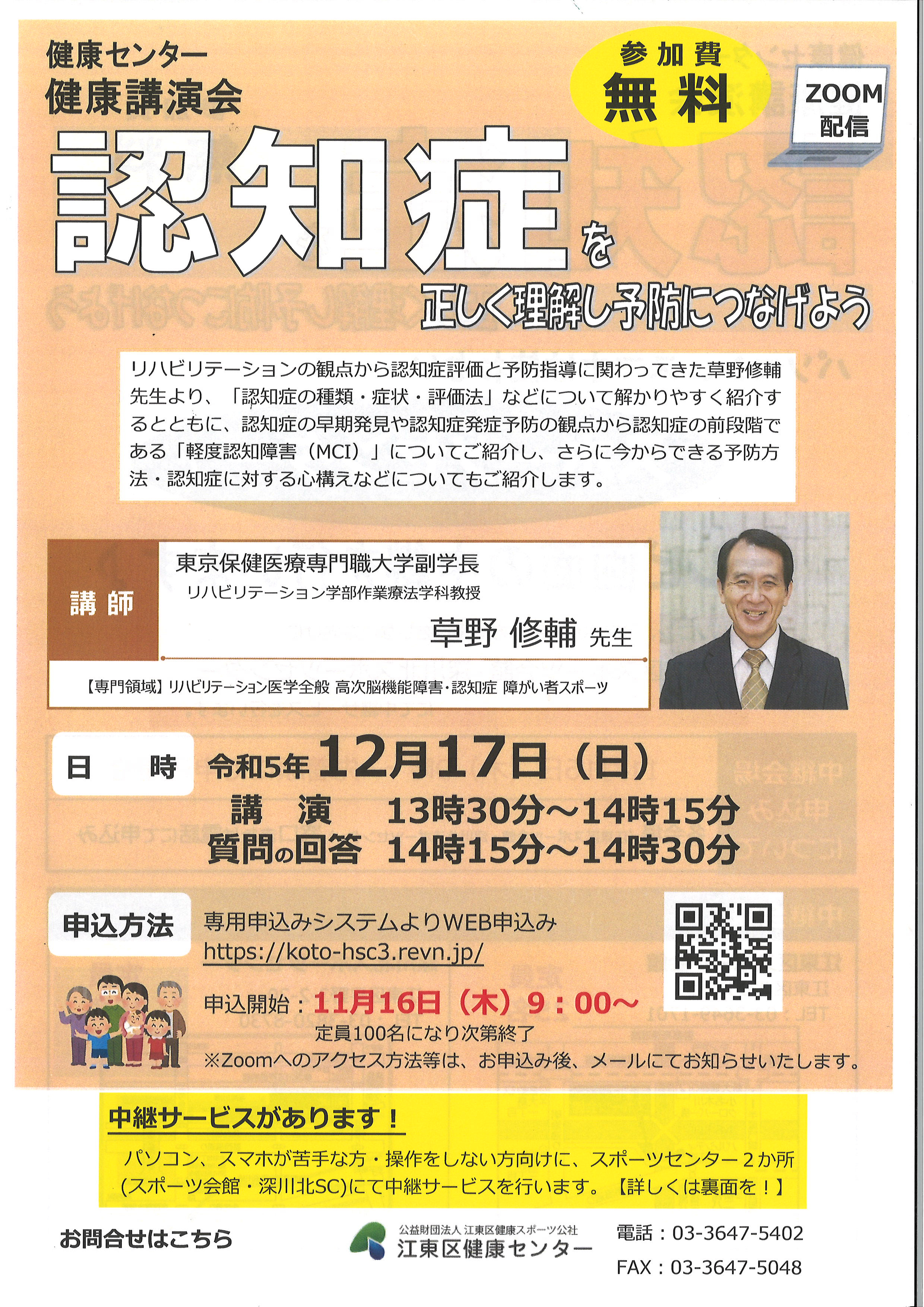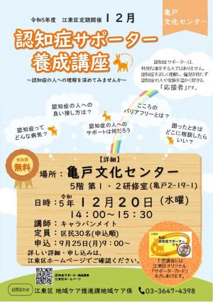 2023.12.12 お知らせ 12/17(日)認知症を正しく理解し予防につなげよう【枝川包括】 Tweet シェアする 健康センターにて健康講演会が開催されます 専用申込システムでのお申し込みになります。 本日確認したところ、まだ空きがあるようでしたので 関心がありましたらお申込みください。 #認知症 前の記事 2023.12.12 お知らせ 12/20(水)社協カフェ【枝川包括】 次の記事 2023.12.11 お知らせ 12/20(水)亀戸文化センターにて認知症サポーター養成講座参加者募集中【枝川包括】 一覧へ戻る