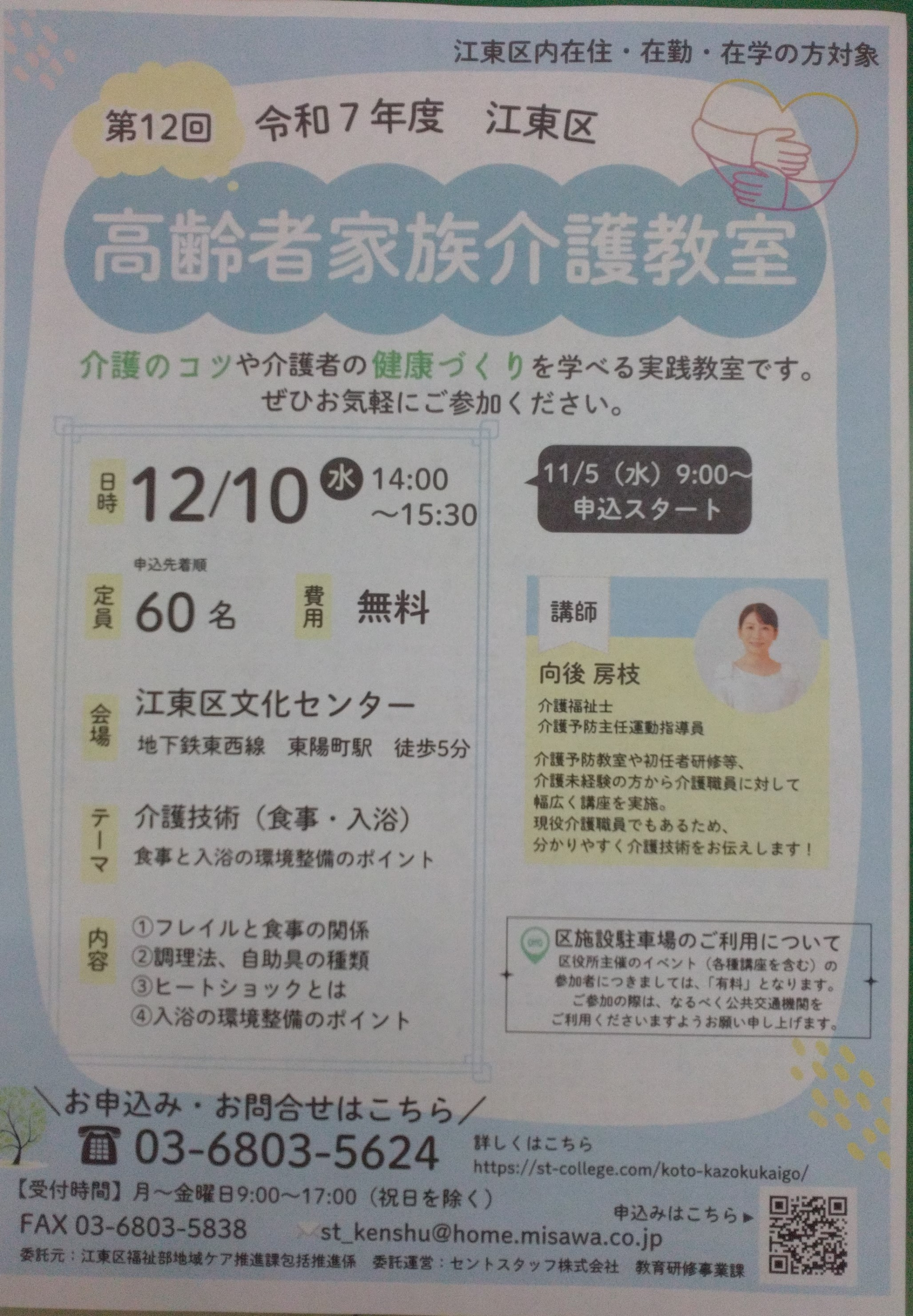 介護を始めたばかりの方、自分の介護の仕方は合ってるのかしら?介護にお悩みの方など、是非ご参加ください。(E・E)