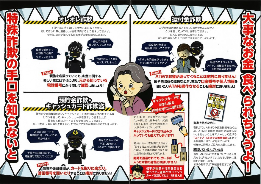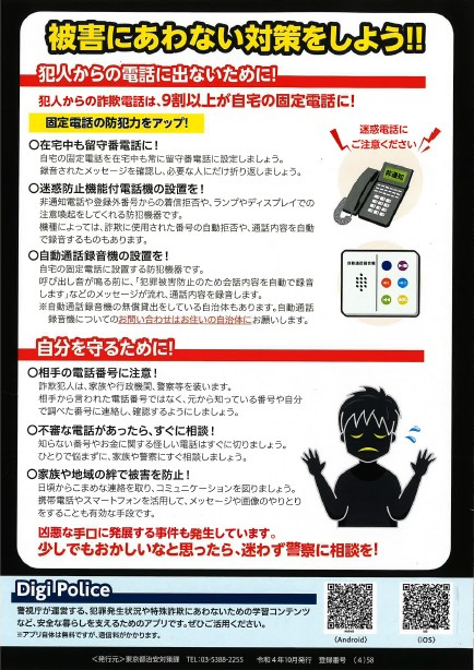 最近、枝川長寿サポートセンターの管内でも詐欺被害が増えています。不審な電話や訪問にはくれぐれもお気をつけください。