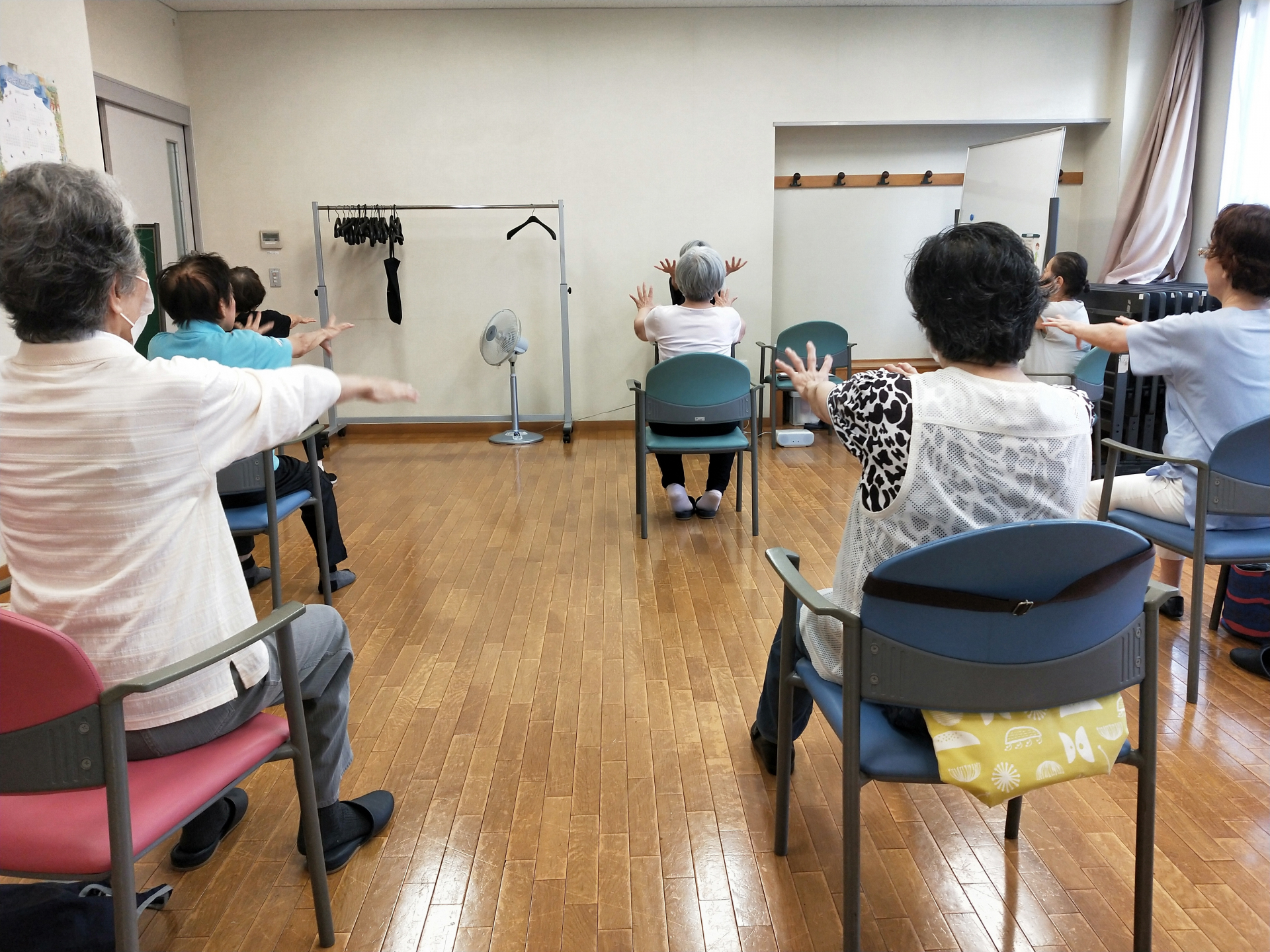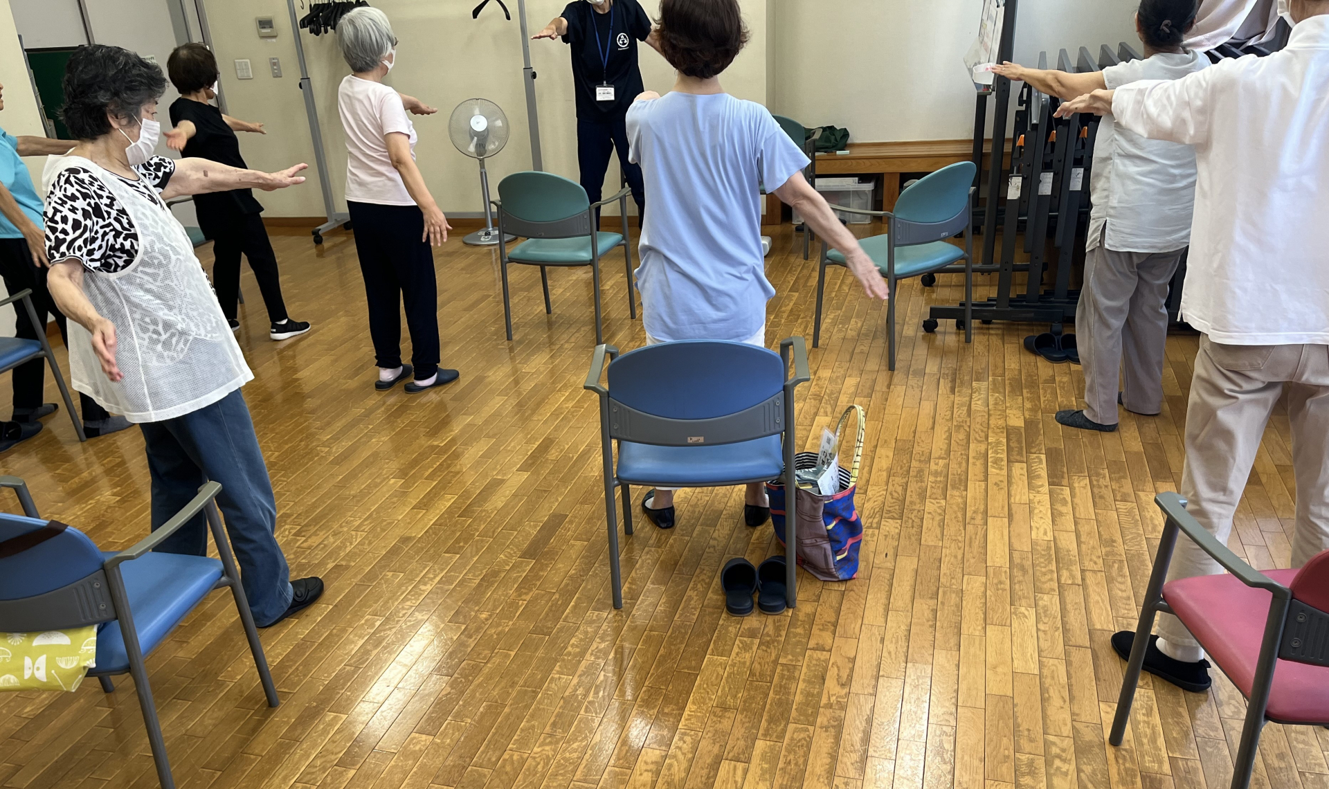 約一時間半、全身を使って体操や筋力トレーニング、音楽に合わせたリズム体操やラジオ体操などを行っています。