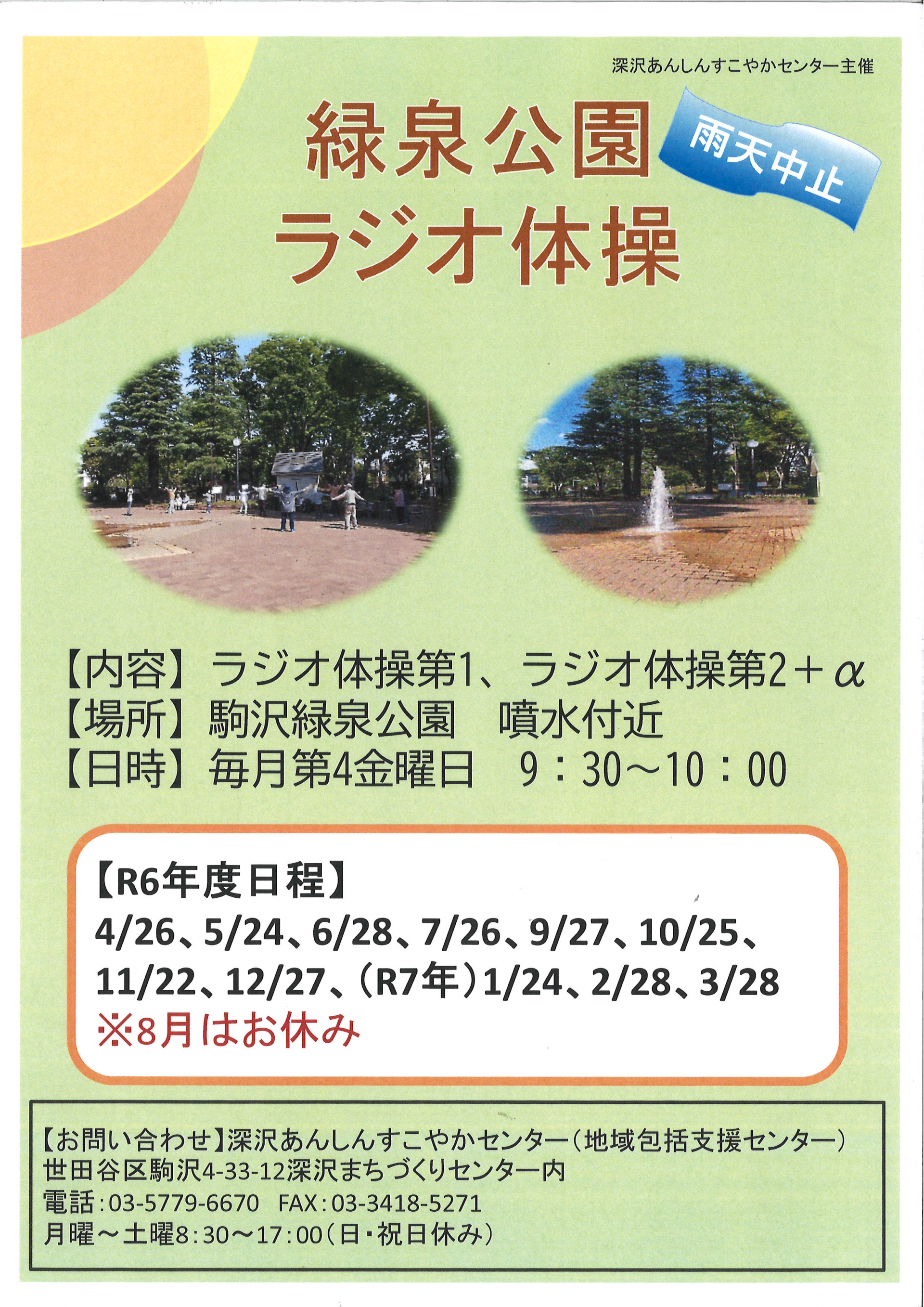 昨日に引き続き、本日は駒沢緑泉公園でラジオ体操を実施しました。