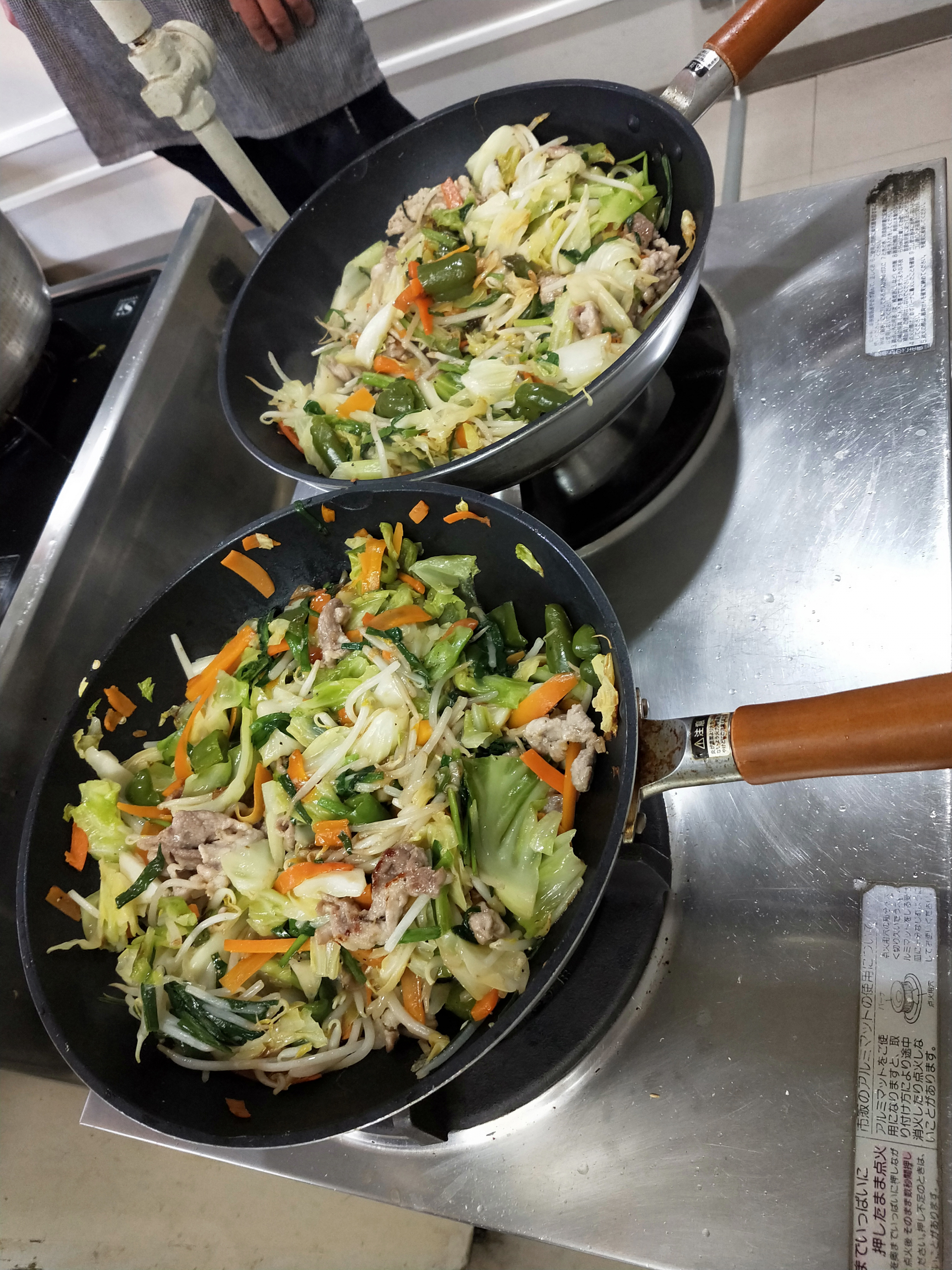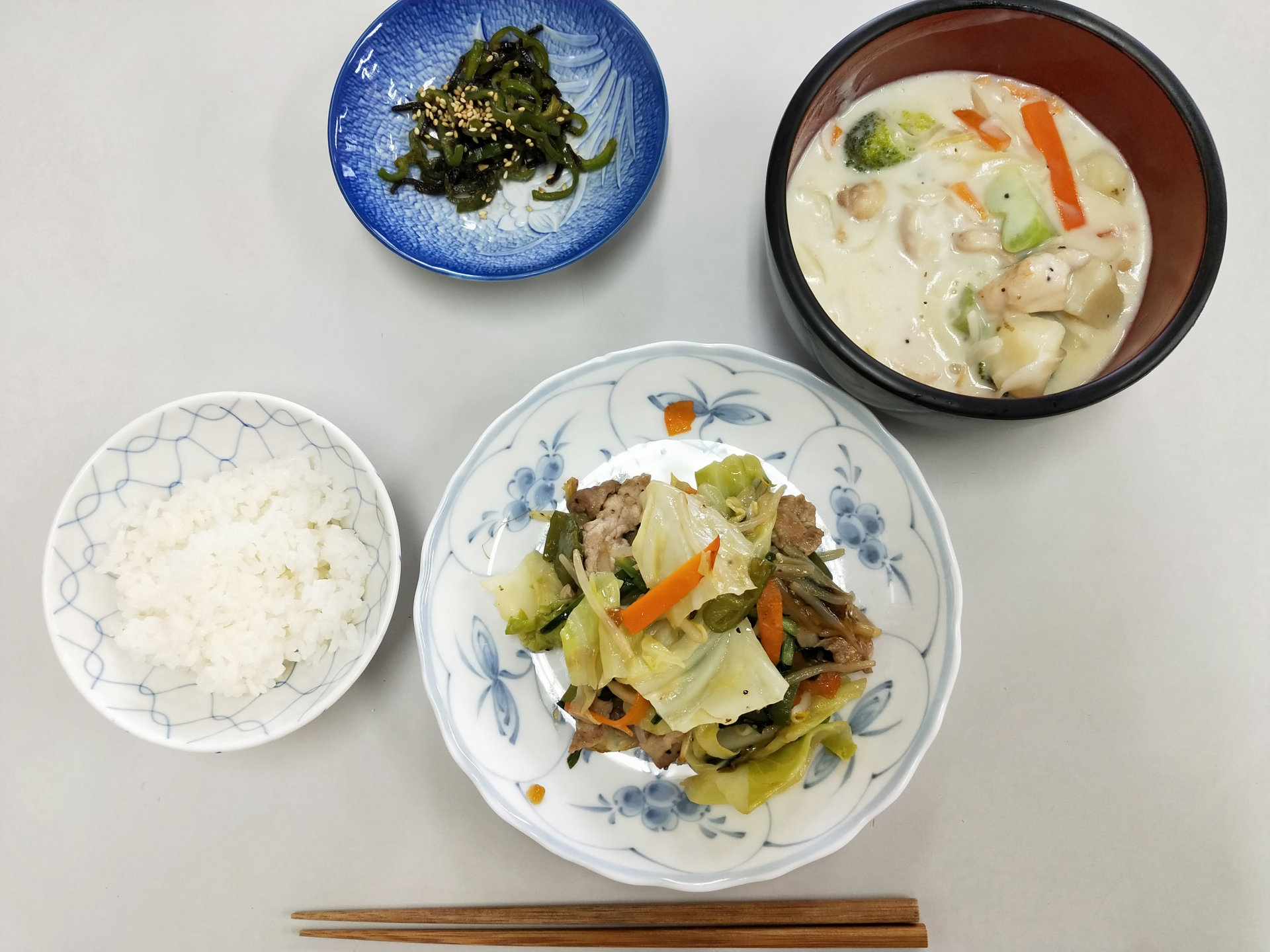 今日のメニューは 野菜炒め、シチュー、ピーマンサラダ、