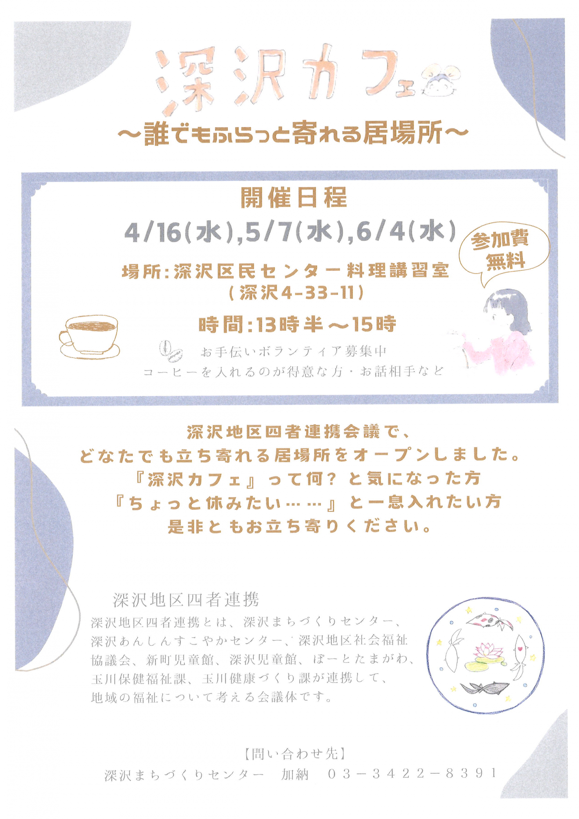 深沢カフェは深沢地区四者連携(深沢まちづくりセンター、深沢あんしんすこやかセンター、深沢地区社会福祉協議会、新町児童館、深沢児童館、ぽーとたまがわ、玉川保健福祉課、玉川健康づくり課)が連携し開催しているカフェです。