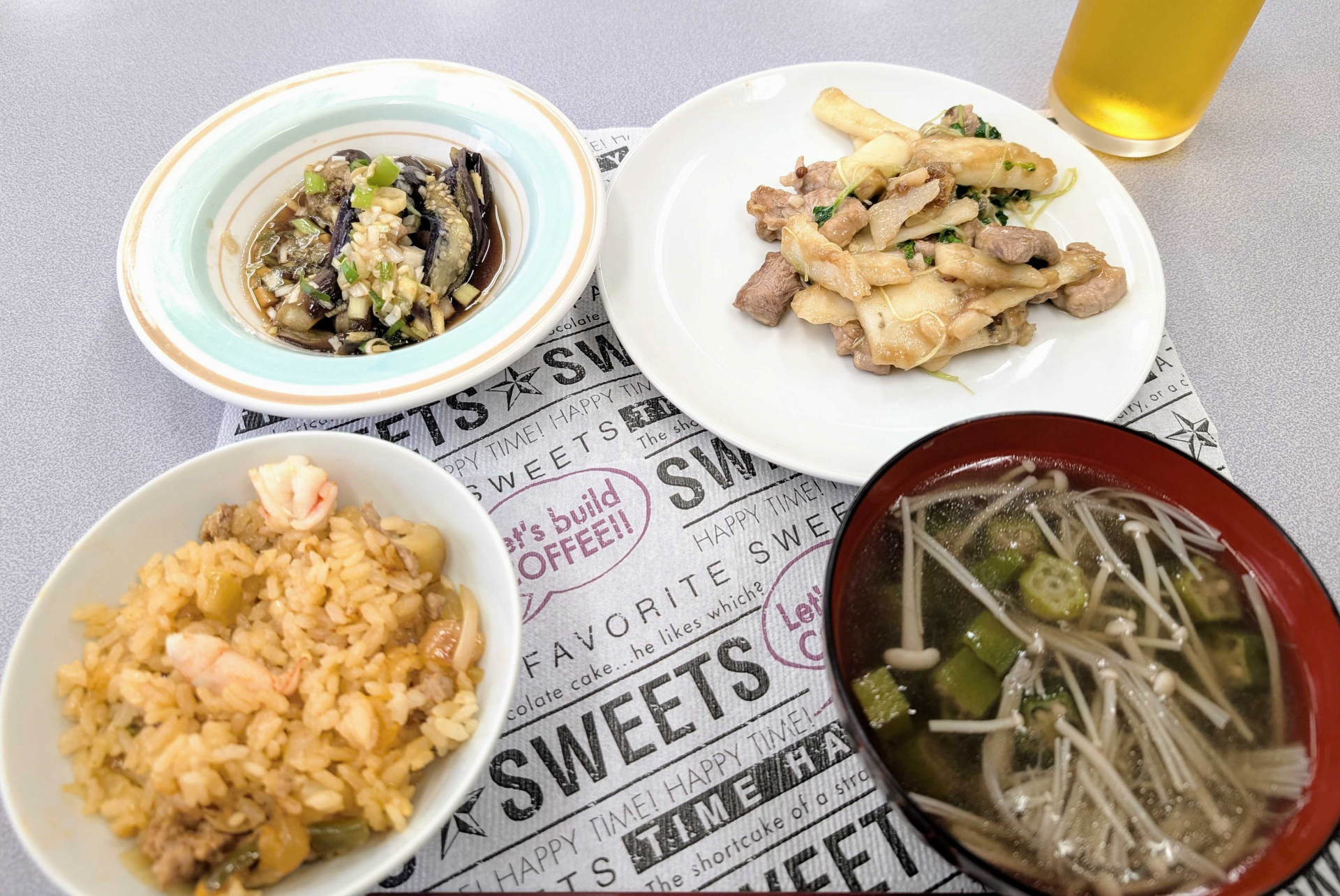 本日のランチメニューは、ナシゴレン・長いもと豚ひれ肉の中華炒め・茄子の冷製・オクラとエノキのスープの4品です。美味しく、ボリュームがある満足なお食事メニューでお腹いっぱいになりました。