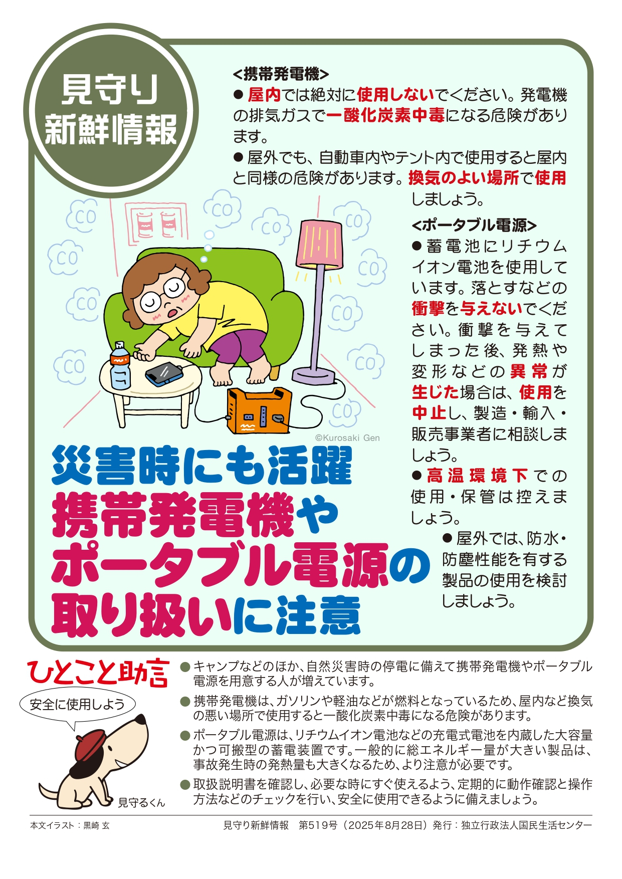 『災害時にも活躍 携帯発電機やポータブル電源の取り扱いに注意』