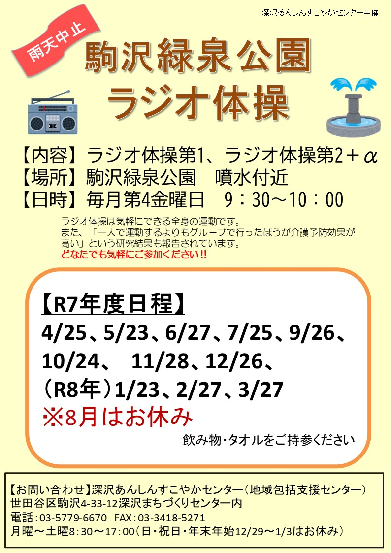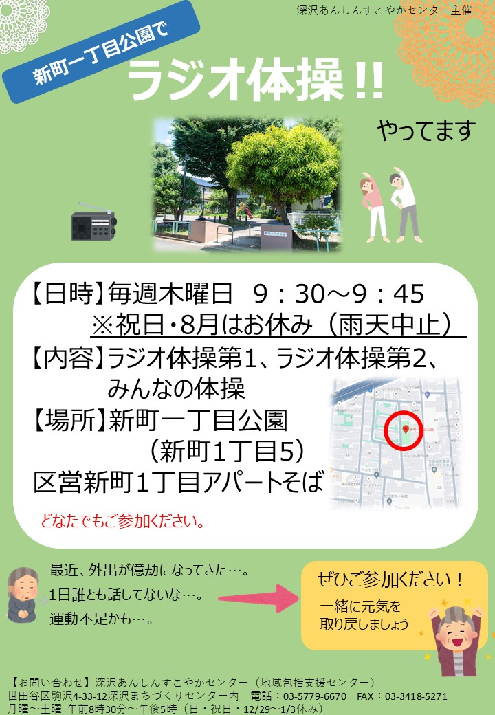 深沢あんしんすこやかセンターでは3カ所で定期的にラジオ体操を実施しています。