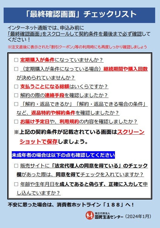 インターネット通販では、注文する前に販売サイトや「最終確認画面」の表示をよく確認しましょう。