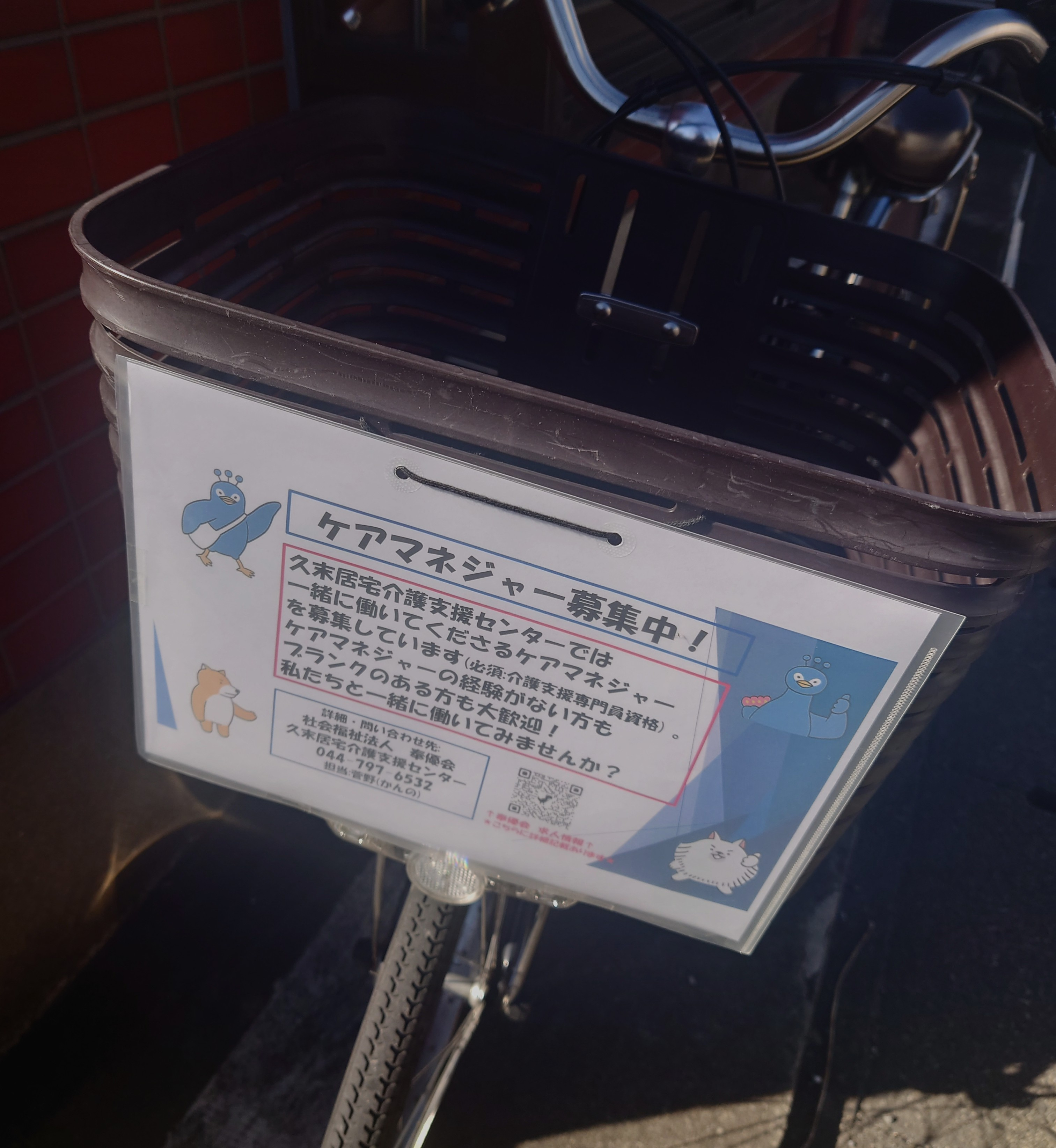 求人のチラシを自転車かごに貼ってみました★これで街中を走り回りたいと思います。