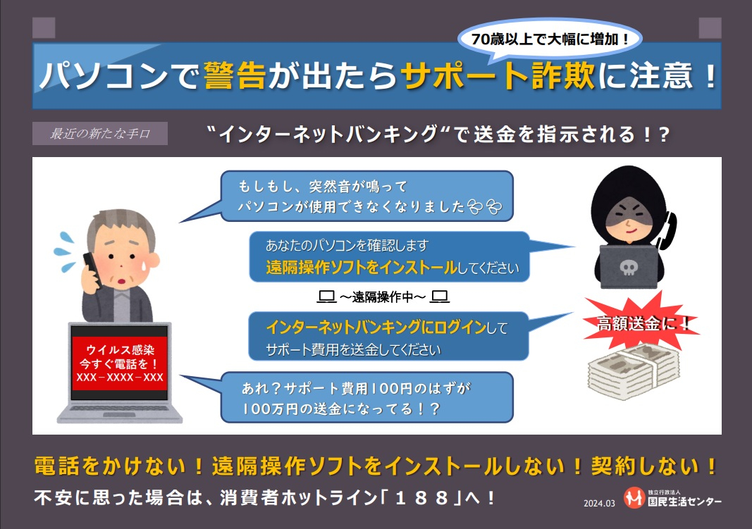 いわゆる「サポート詐欺」の相談が全国の消費生活センター等に依然として多く寄せられています。サポート詐欺とは、パソコンでインターネットを使用中に突然「ウイルスに感染している」等の警告画面や警告音が出て、それらをきっかけに警告画面上に表示されている電話番号に電話をかけさせ、偽のサポートに誘導し、サポート料金を支払わせる手口です。