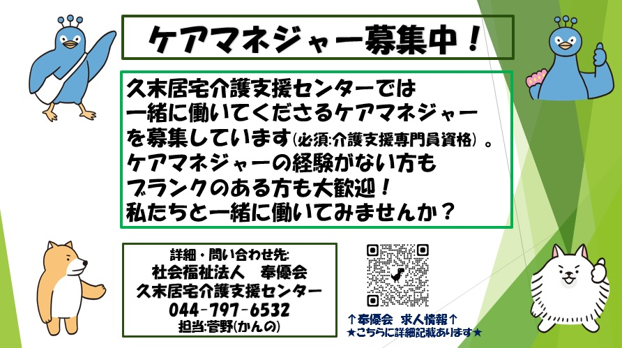 久末居宅介護支援センターよりケアマネジャー募集のお知らせです。