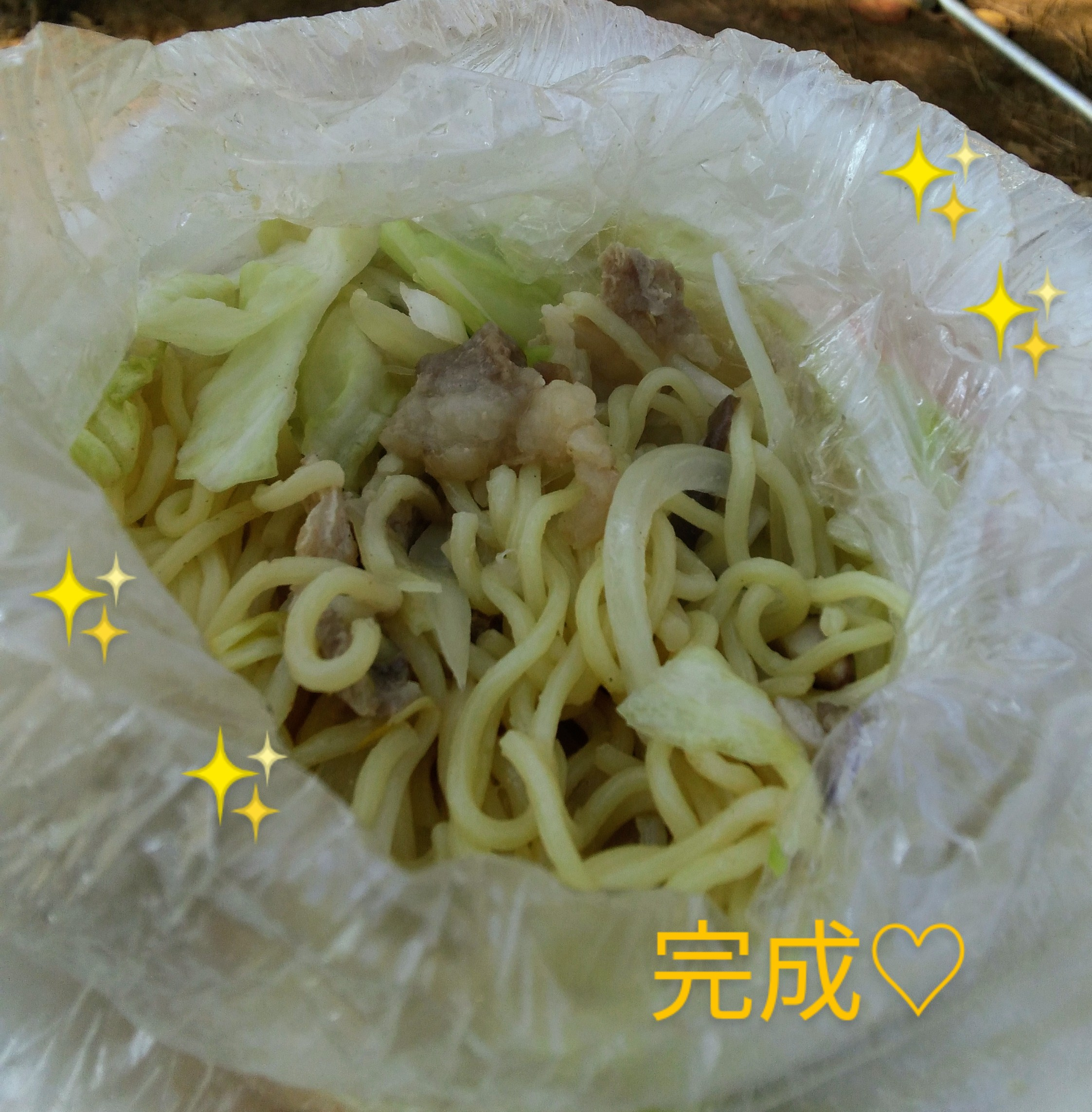 完成品の焼きそばがこちら!食器も汚れないように袋のまま食べます(…なので見た目は二の次です)。