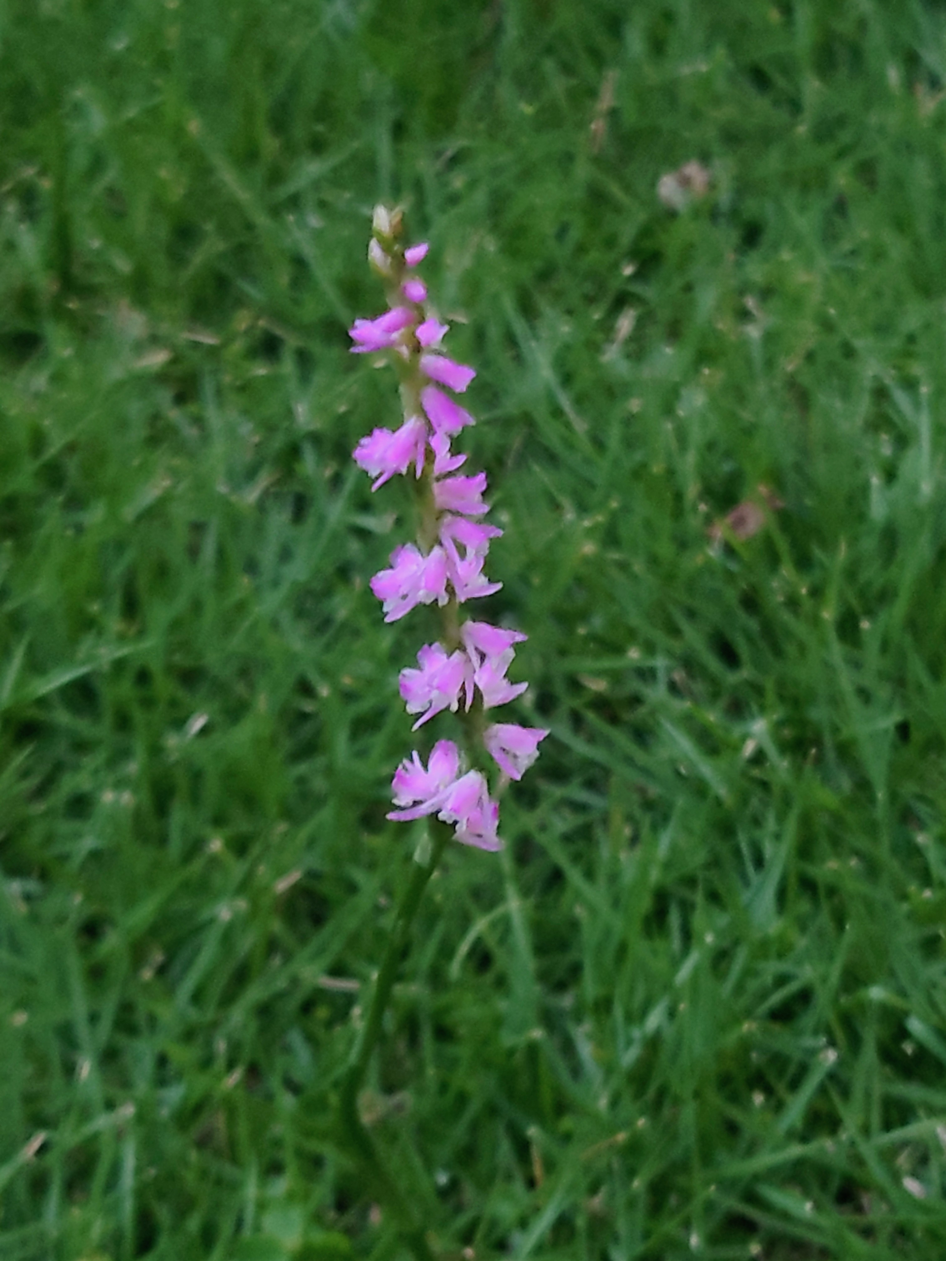 ネジバナです。野生のランだそうで、花茎の周りに螺旋状に並んで咲く「ねじれた花序」が和名の由来だそうです。まさしく文字通りの花です。
