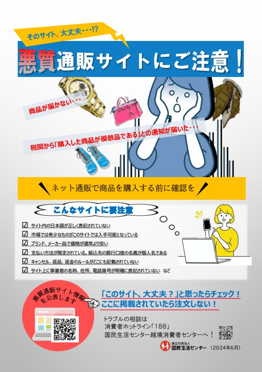 越境消費者センターでは、実際に寄せられた相談の中から、令和6年6月26日より、越境消費者センターウェブサイト上で、随時「悪質通販サイト情報」を公表していきます。