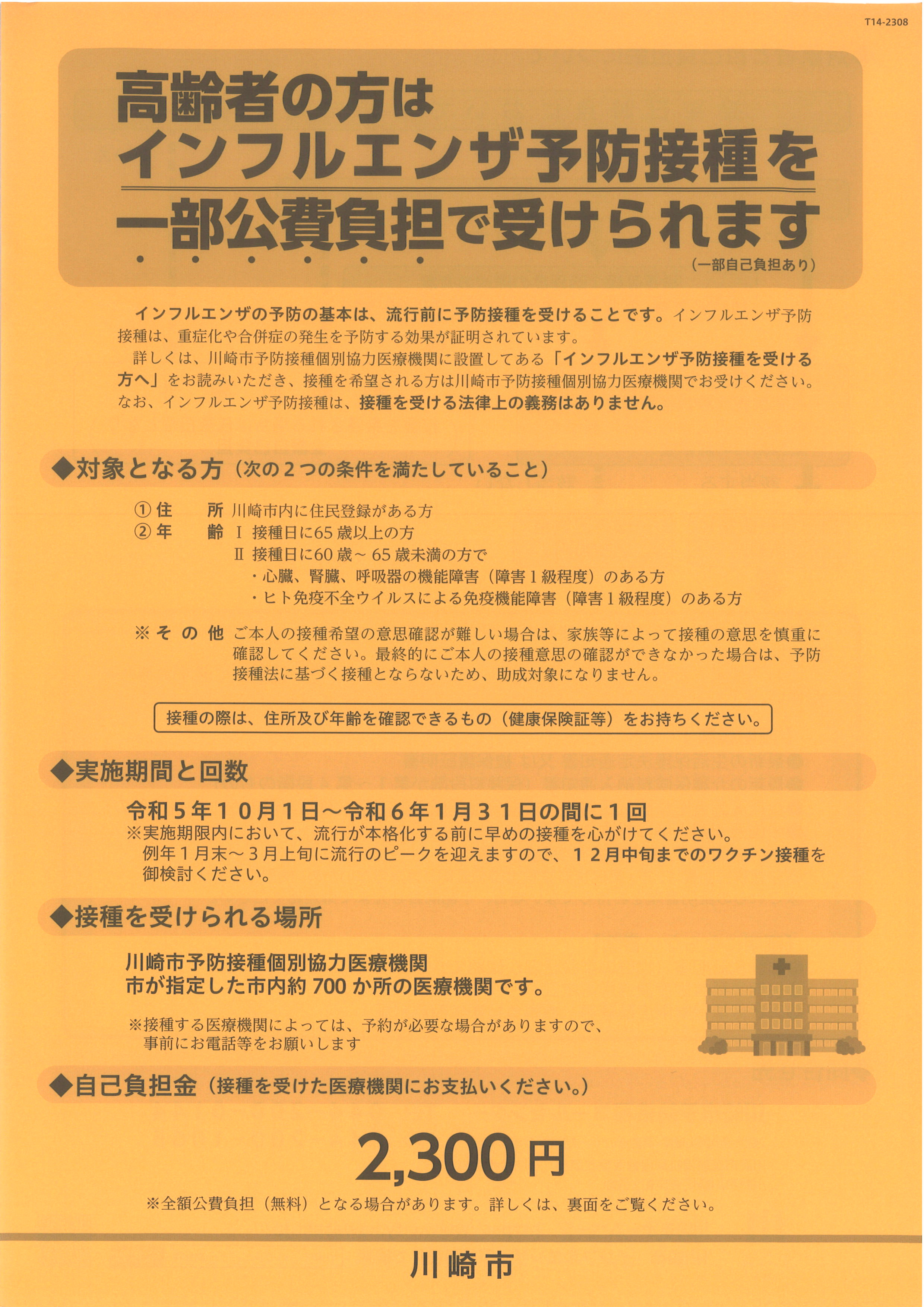 2023.11.28 お知らせ インフルエンザ予防接種【久末居宅】 Tweet シェアする 高齢者の方は、インフルエンザ予防接種を一部公費負担で受けられます。 前の記事 2023.11.29 お知らせ かわさき人権相談【久末居宅】 次の記事 2023.11.27 お知らせ 川崎アイセンターまつり【久末居宅】 一覧へ戻る