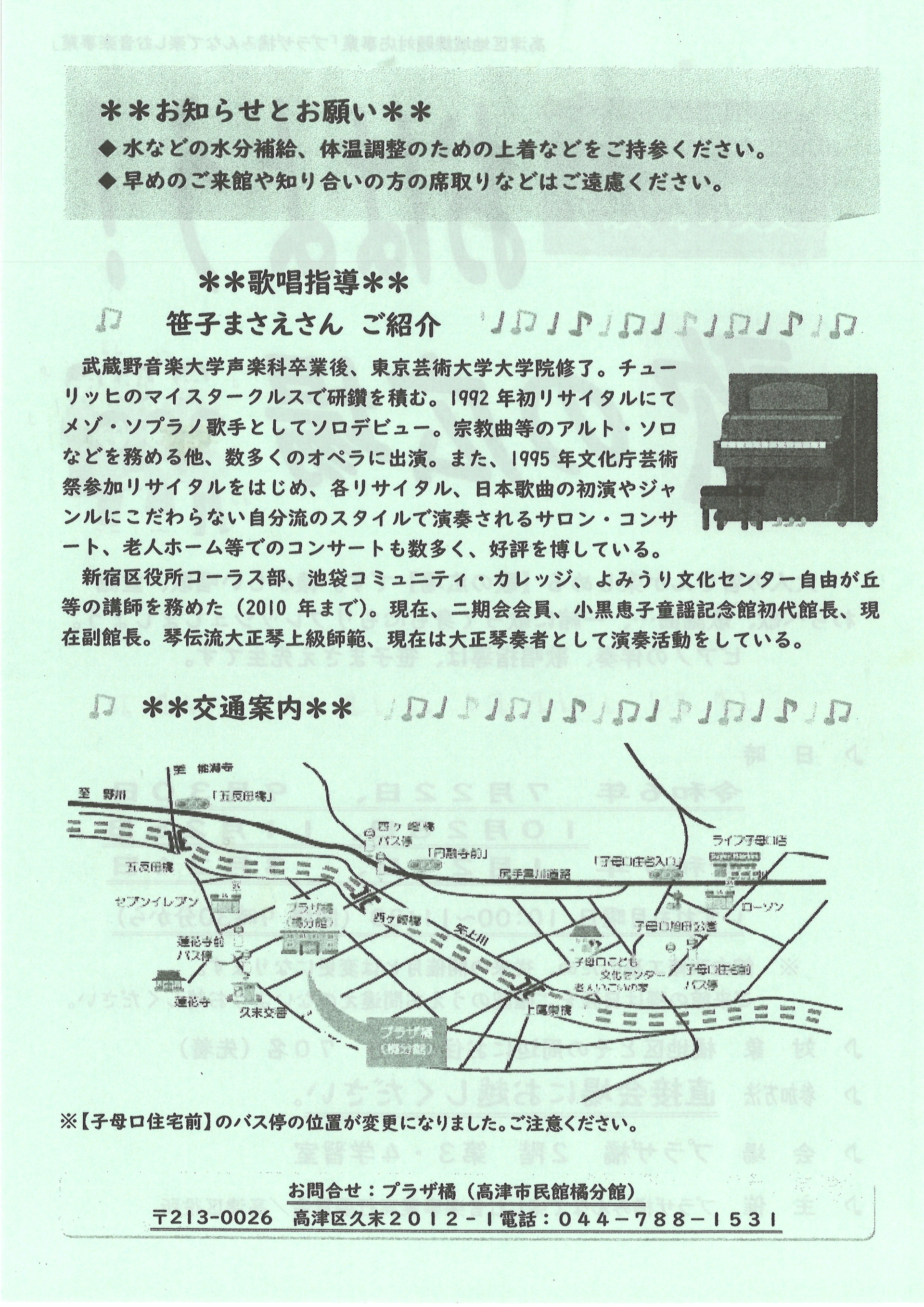 2024.08.30 お知らせ 【久末居宅】おはよう!歌の広場 Tweet シェアする 大人の皆さんが楽しめる「歌の広場」です。 対象は高津区橘地区とその周辺にお住いの方、先着70名です。 当日、直接会場にお越しください。 【久末居宅 S】 前の記事 2024.08.30 お知らせ 【久末居宅】「ふらっとひだまり」に寄ってみましょう 次の記事 2024.08.29 お知らせ 【久末居宅】夏の花壇③ 一覧へ戻る