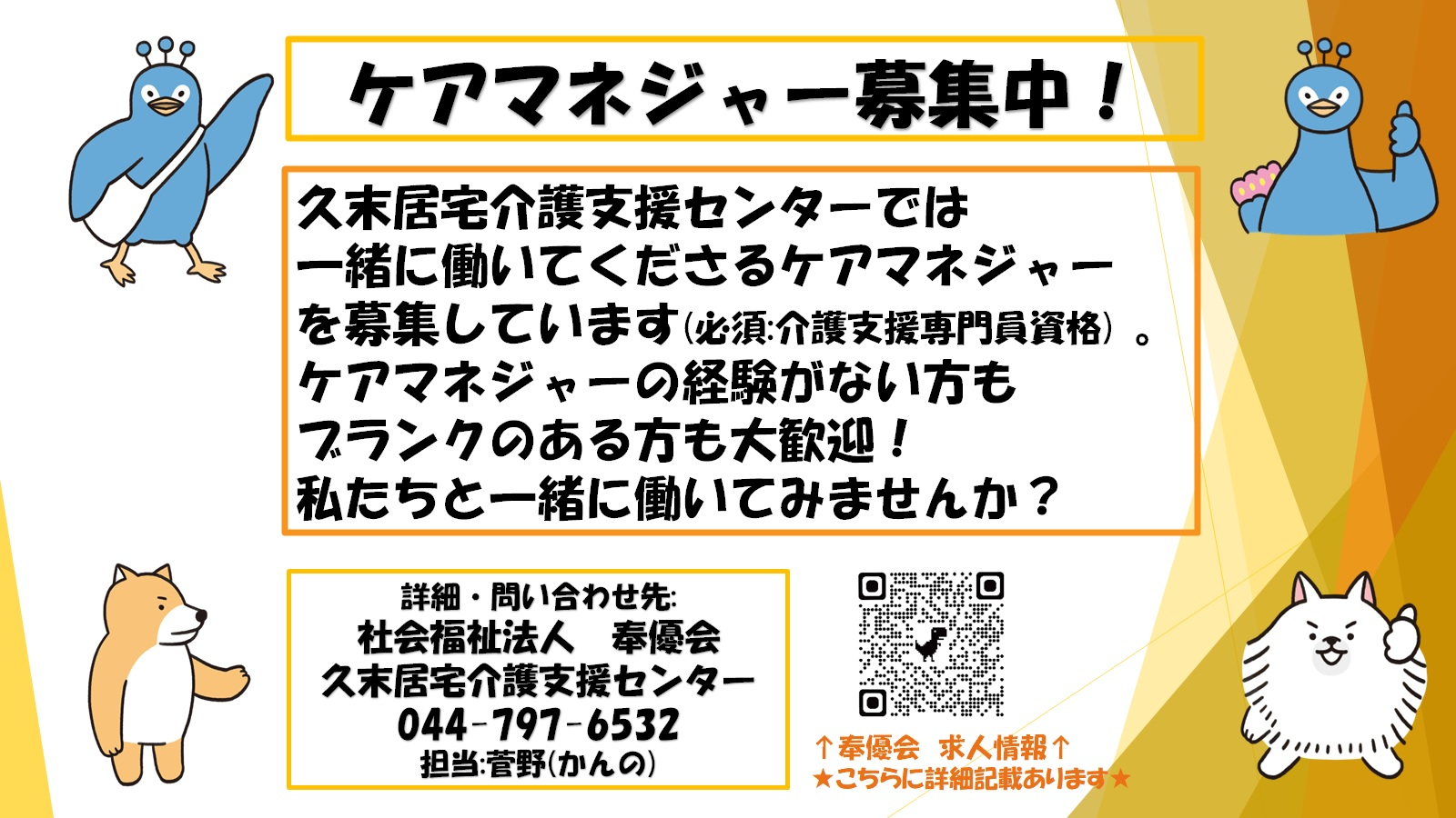 久末居宅介護支援センターでは一緒に働いてくださるケアマネジャーを募集しております。