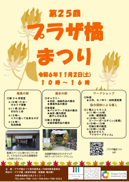 令和6年11月2日土曜日、第25回プラザ橘まつりを開催します。日頃からプラザ橘を利用している団体さんの発表や作品の展示、血圧や握力の測定、工作、モノ作りのワークショップ、また、協力団体さんによる催しもあります。