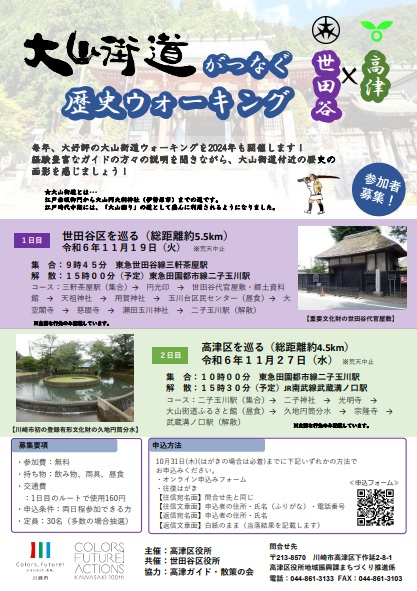高津区より大山街道がつなぐ世田谷・高津歴史ウォーキング参加者募集のお知らせです。
