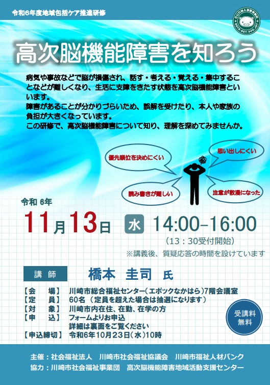 川崎市福祉人材バンクより 高次脳機能障害を知ろう 研修開催のお知らせです。