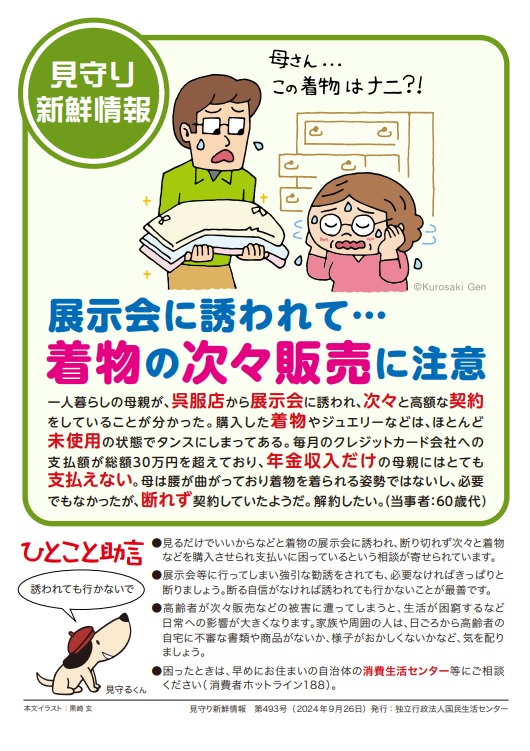見るだけでいいからなどと着物の展示会に誘われ、断り切れず次々と着物などを購入させられ支払いに困っているという相談が寄せられています。