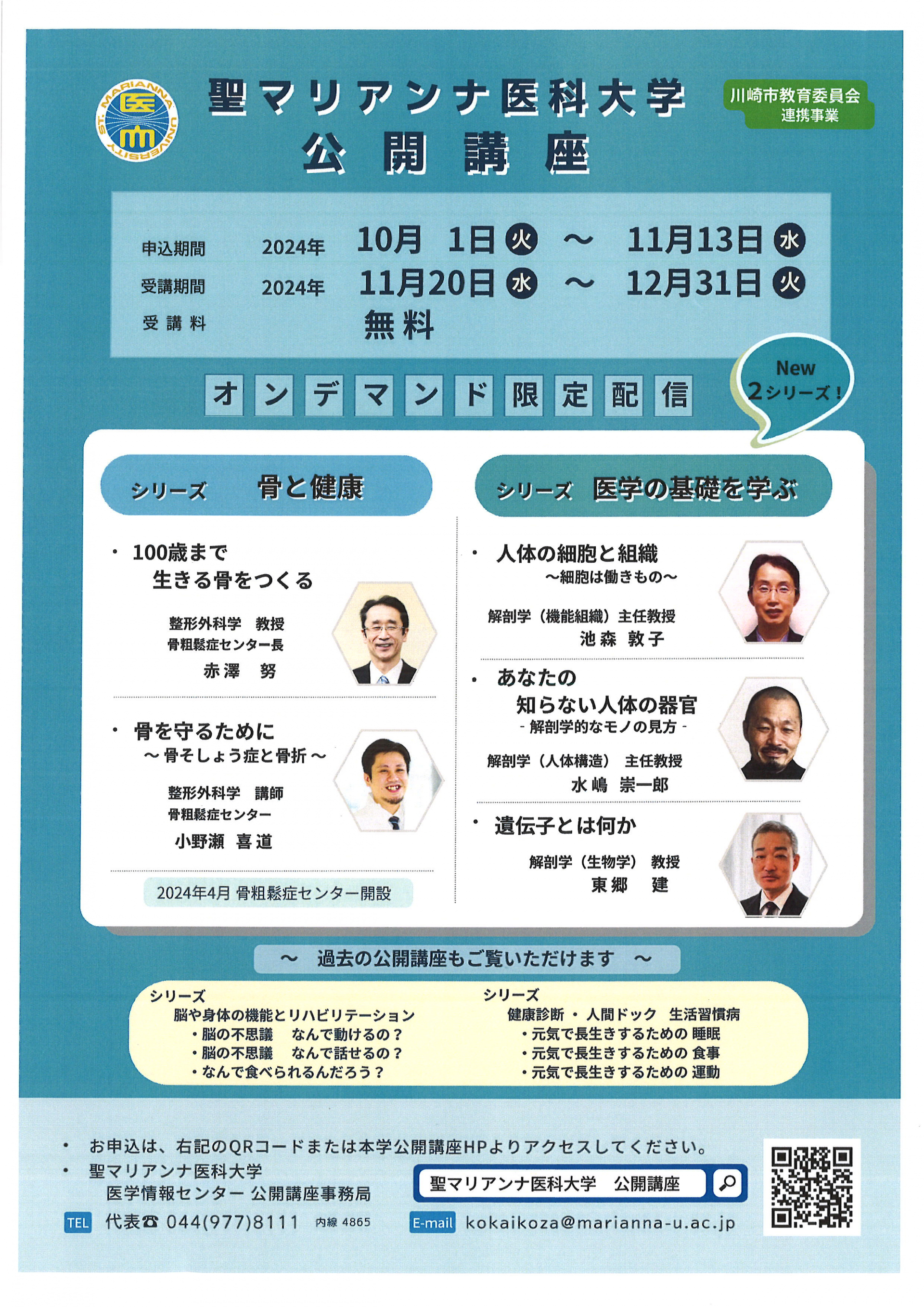 2024.10.23 お知らせ 【久末居宅】聖マリアンナ医科大学公開講座 Tweet シェアする 川崎市教育委員会連携事業のお知らせです。 テーマは「骨と健康」「医学の基礎を学ぶ」です。 【久末居宅 S】 前の記事 2024.10.23 お知らせ 【久末居宅】第3回 川崎市長杯 ボッチャ大会 次の記事 2024.10.23 お知らせ 【久末居宅】川崎愛 遊びつくす3日間 一覧へ戻る