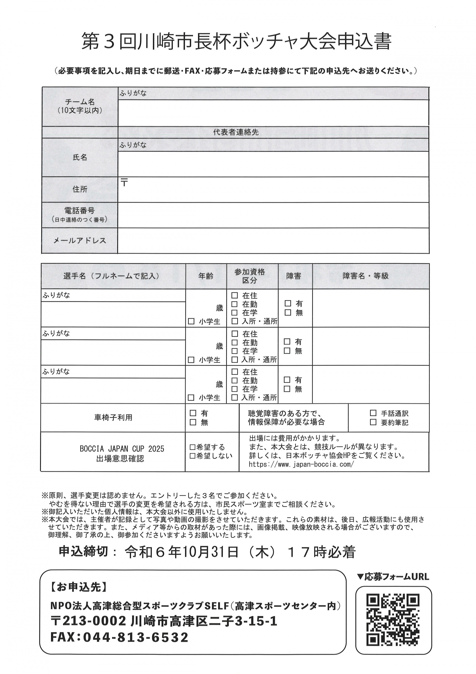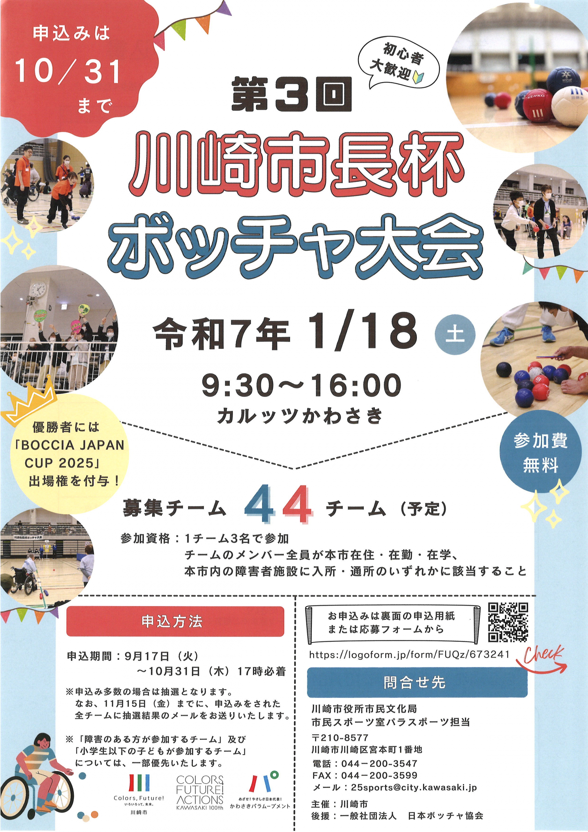2024.10.23 お知らせ 【久末居宅】第3回 川崎市長杯 ボッチャ大会 Tweet シェアする ボッチャ大会参加チームを募集しています。 初心者も大歓迎です! 【久末居宅 S】 前の記事 2024.10.23 お知らせ 【久末居宅】世田谷・神奈川エリア 事例研究発表会 予選 次の記事 2024.10.23 お知らせ 【久末居宅】聖マリアンナ医科大学公開講座 一覧へ戻る