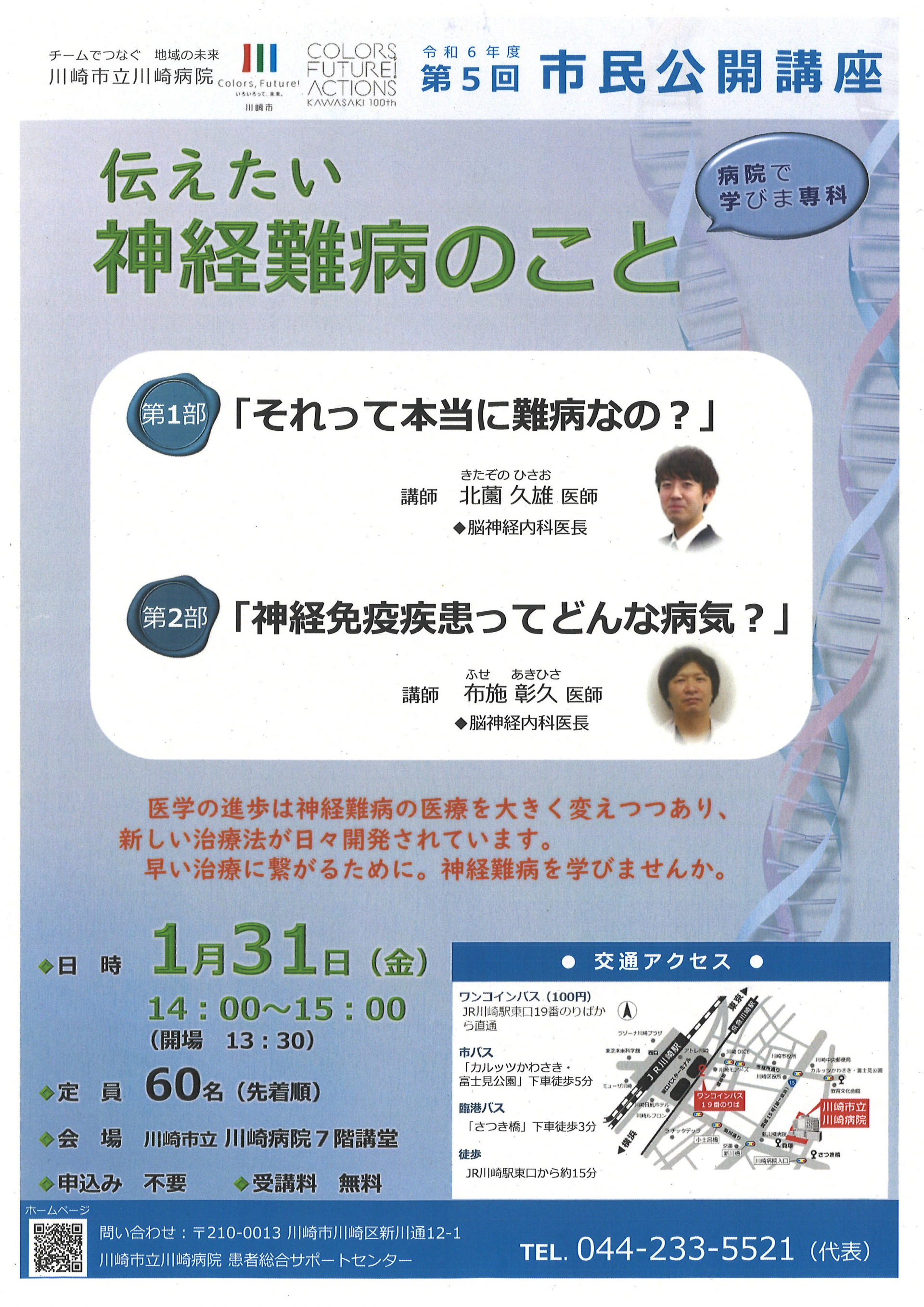 2025.01.27 お知らせ 【久末居宅】令和6年度 第5回 市民公開講座。 Tweet シェアする 令和6年度 第5回 市民公開講座のお知らせです。 テーマは「神経難病のこと」です。 医学の進歩は神経難病の医療を大きく変えつつあり、新しい治療法が日々開発されています。 【久末居宅 s】 前の記事 2025.01.27 お知らせ 【久末居宅】みんなの健康塾ちゃんねる 1月号。 次の記事 2025.01.23 お知らせ 【久末居宅】令和6年度 顧客満足度調査 結果報告 一覧へ戻る