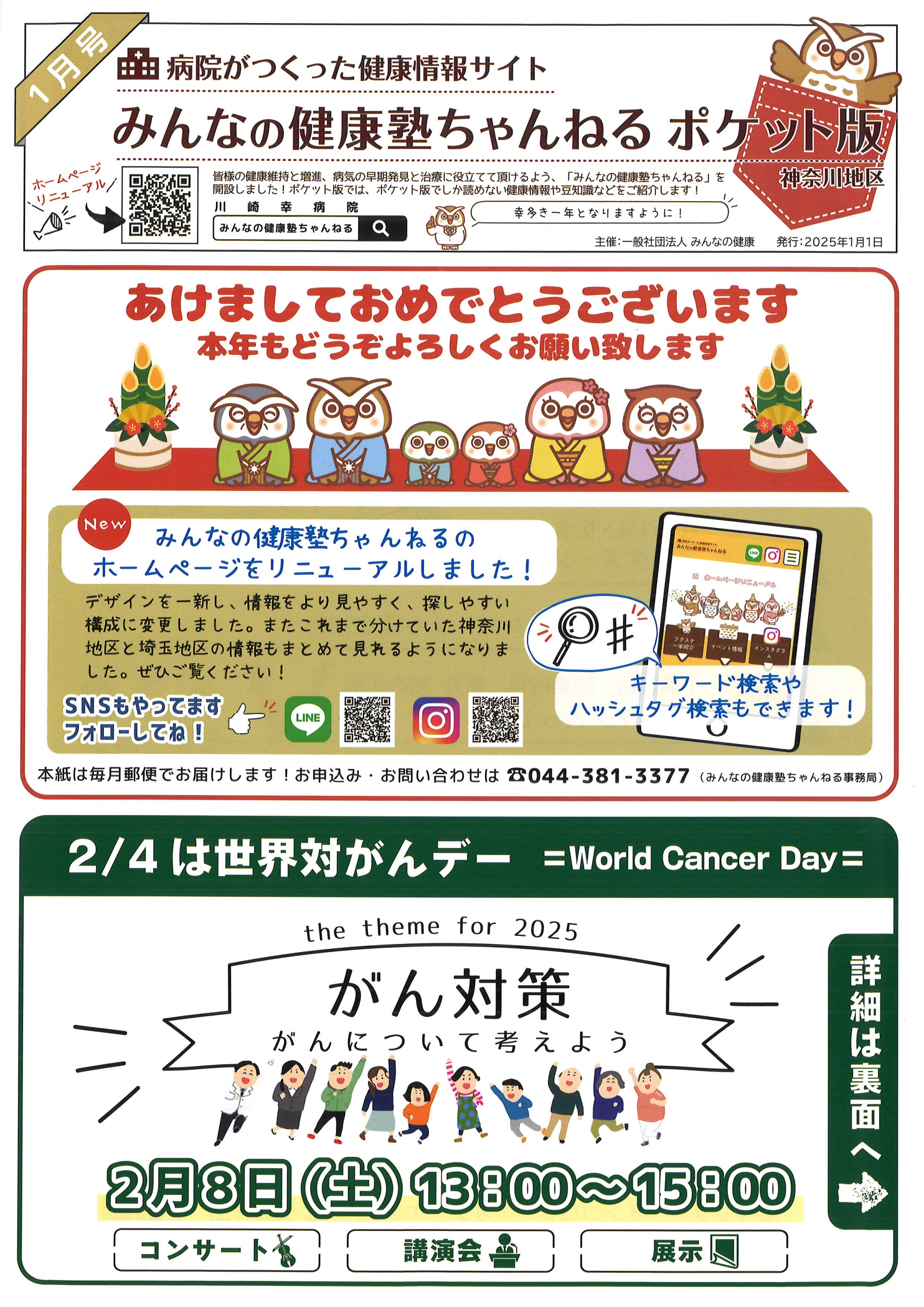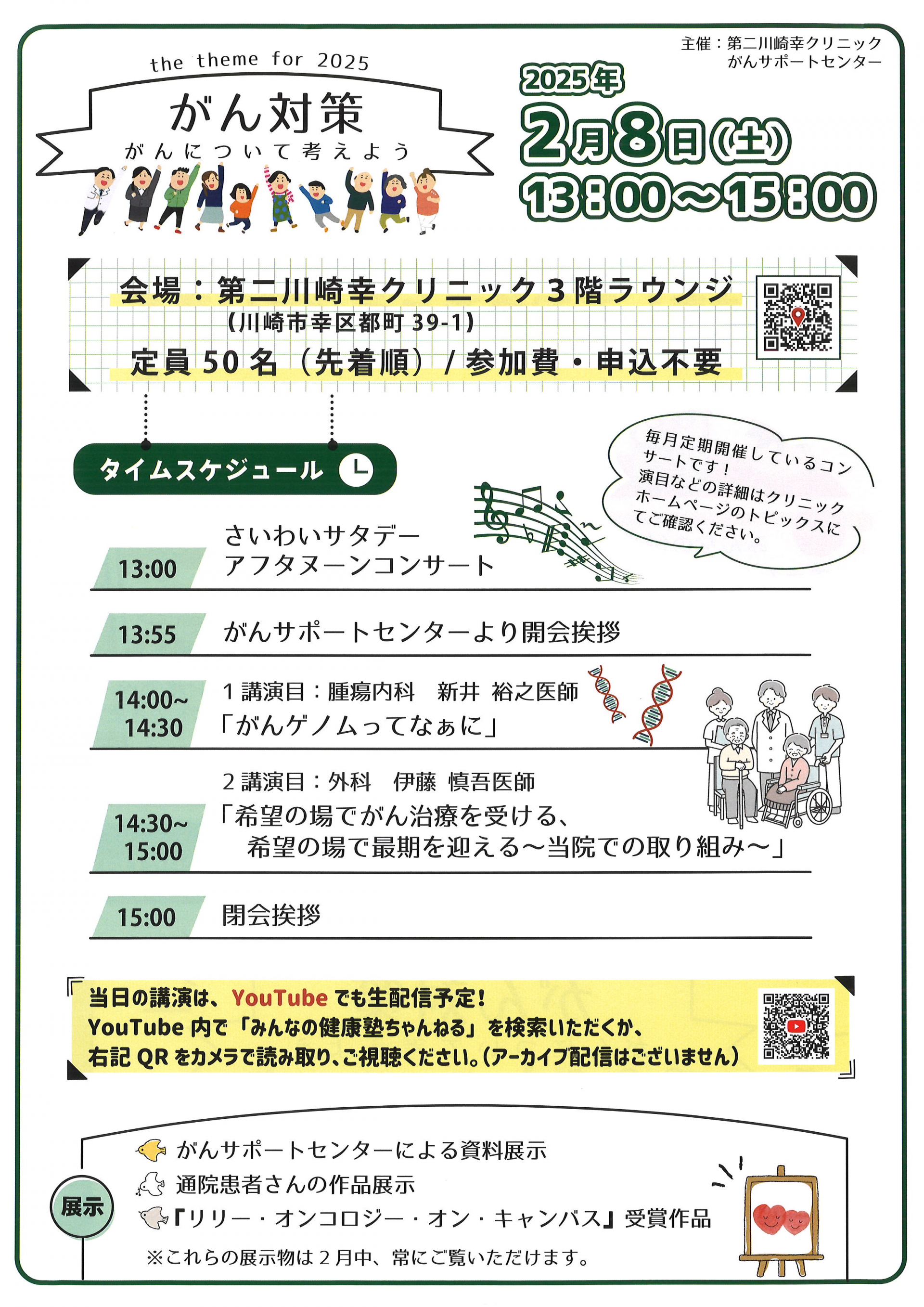 2025.01.27 お知らせ 【久末居宅】みんなの健康塾ちゃんねる 1月号。 Tweet シェアする 2/4は世界対がんデーです。 2月8日(土)13:00~15:00第二川崎幸クリニックにて、コンサートや講演会を行います! 【久末居宅 s】 前の記事 2025.01.28 お知らせ 【久末居宅】川崎市人権学校。 次の記事 2025.01.27 お知らせ 【久末居宅】令和6年度 第5回 市民公開講座。 一覧へ戻る