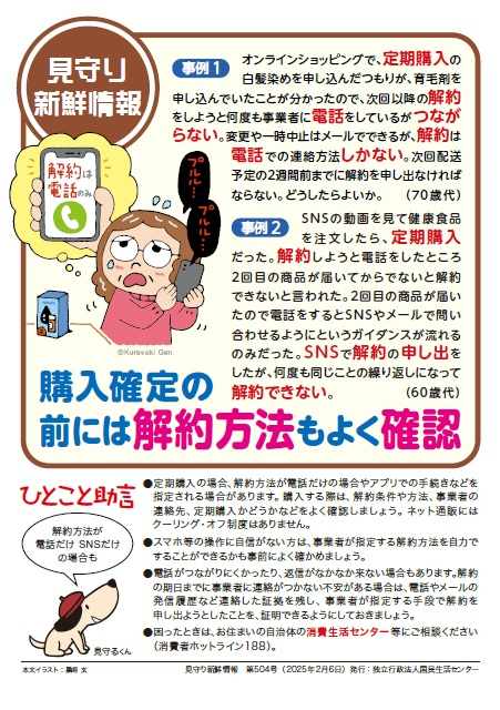 定期購入の場合、解約方法が電話だけの場合やアプリでの手続きなどを指定される場合があります。購入する際は、解約条件や方法、事業者の連絡先、定期購入かどうかなどをよく確認しましょう。ネット通販にはクーリング・オフ制度はありません。