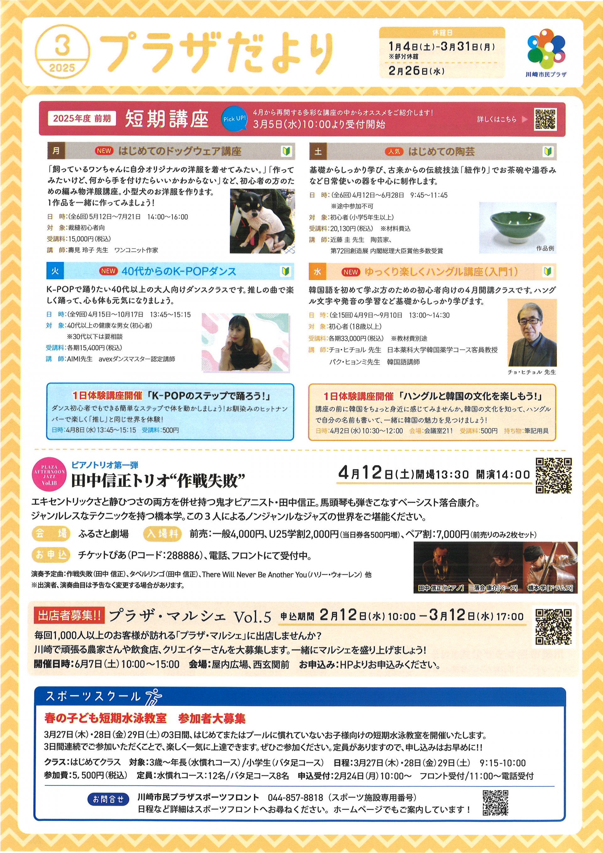 2025.03.21 お知らせ 【久末居宅】プラザだより3月号。 Tweet シェアする プラザだより3月号です。 各種短期講座募集中です! 【久末居宅 S】 前の記事 2025.03.25 お知らせ 【久末居宅】炊き出し訓練。 次の記事 2025.03.21 お知らせ 【久末居宅】プラザ橘だより。 一覧へ戻る