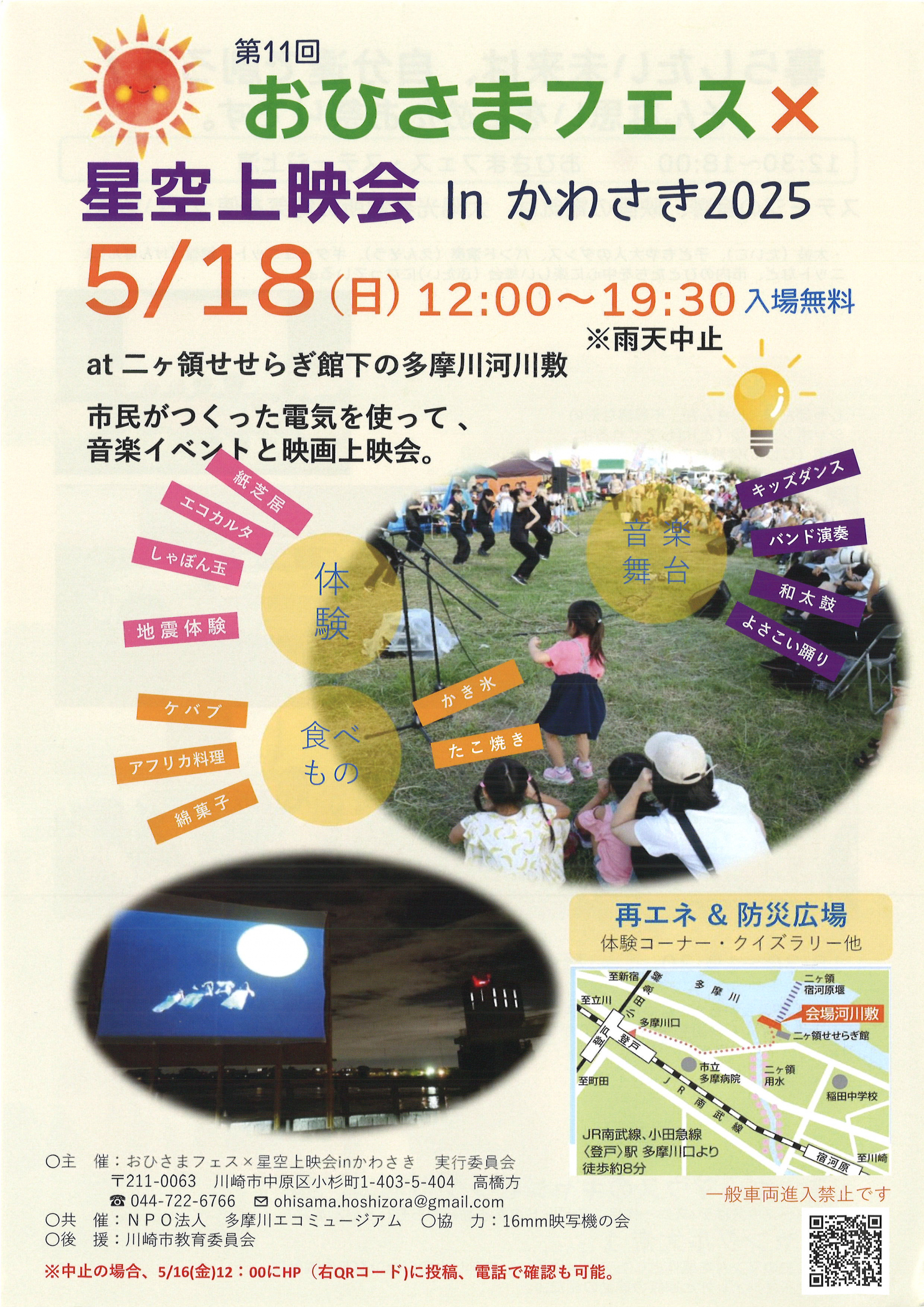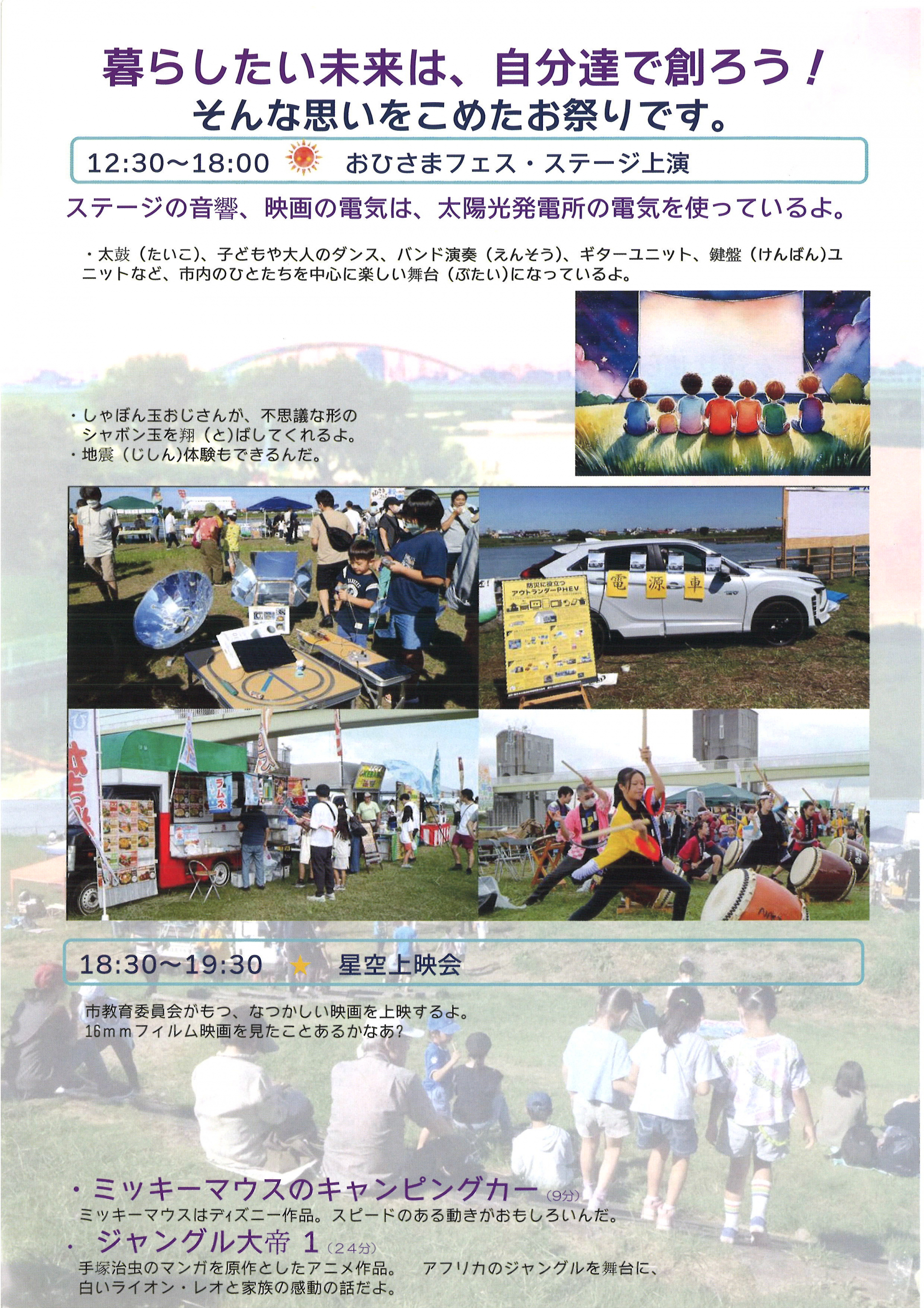 2025.03.28 お知らせ 【久末居宅】第11回おひさまフェス×星空上映会inかわさき2025。 Tweet シェアする 第11回おひさまフェス×星空上映会のお知らせです。 市民がつくった電気を使って、音楽イベントと映画上映会を開催します!【久末居宅 S】 前の記事 2025.03.31 お知らせ 【久末居宅】異動のお知らせとお礼 次の記事 2025.03.28 お知らせ 【久末居宅】アプリで生き物探し!~全国都市緑化かわさきフェア春編~ 一覧へ戻る