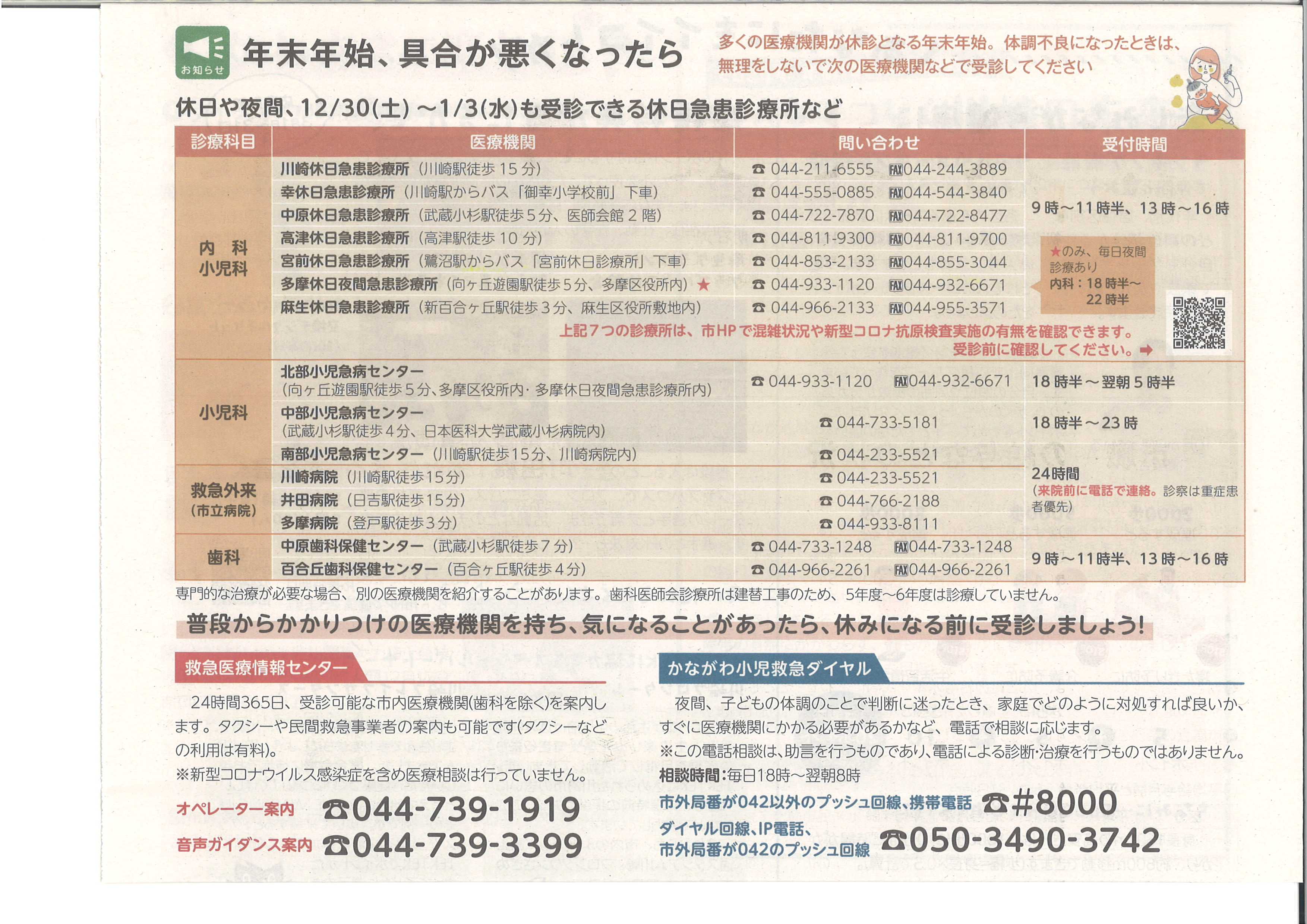 2023.12.26 お知らせ 【久末居宅】年末年始、具合が悪くなったら Tweet シェアする 休日や夜間、12/30(土)~1/3(水)も受診できる休日急患診療所などのお知らせです。 前の記事 2023.12.26 お知らせ 【久末居宅】市役所などの業務は 年末は12月28日まで 年始は1月4日から 次の記事 2023.12.26 お知らせ 【久末居宅】川崎市 インフルエンザ予防接種 一部公費負担 一覧へ戻る