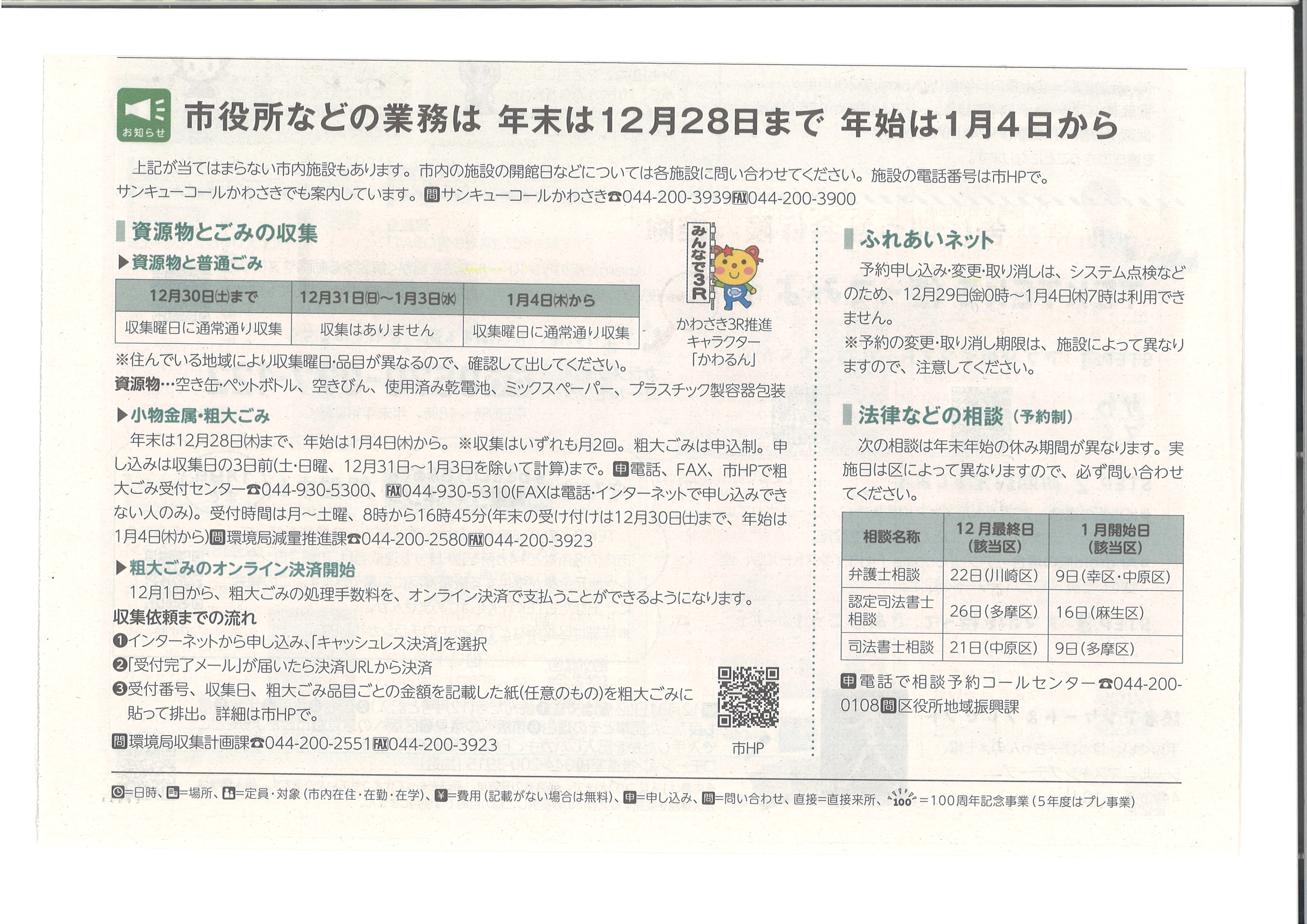 2023.12.26 お知らせ 【久末居宅】市役所などの業務は 年末は12月28日まで 年始は1月4日から Tweet シェアする 資源物とごみの収集、ふれあいネット、法律などの相談の年末年始のお知らせです。 前の記事 2024.01.04 お知らせ 【久末居宅】新年のご挨拶 次の記事 2023.12.26 お知らせ 【久末居宅】年末年始、具合が悪くなったら 一覧へ戻る