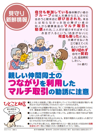 - 友人や知人を勧誘して買い手を増やしていくマルチ取引の勧誘が障がい者同士のつながりを利用して行われているケースがみられます。