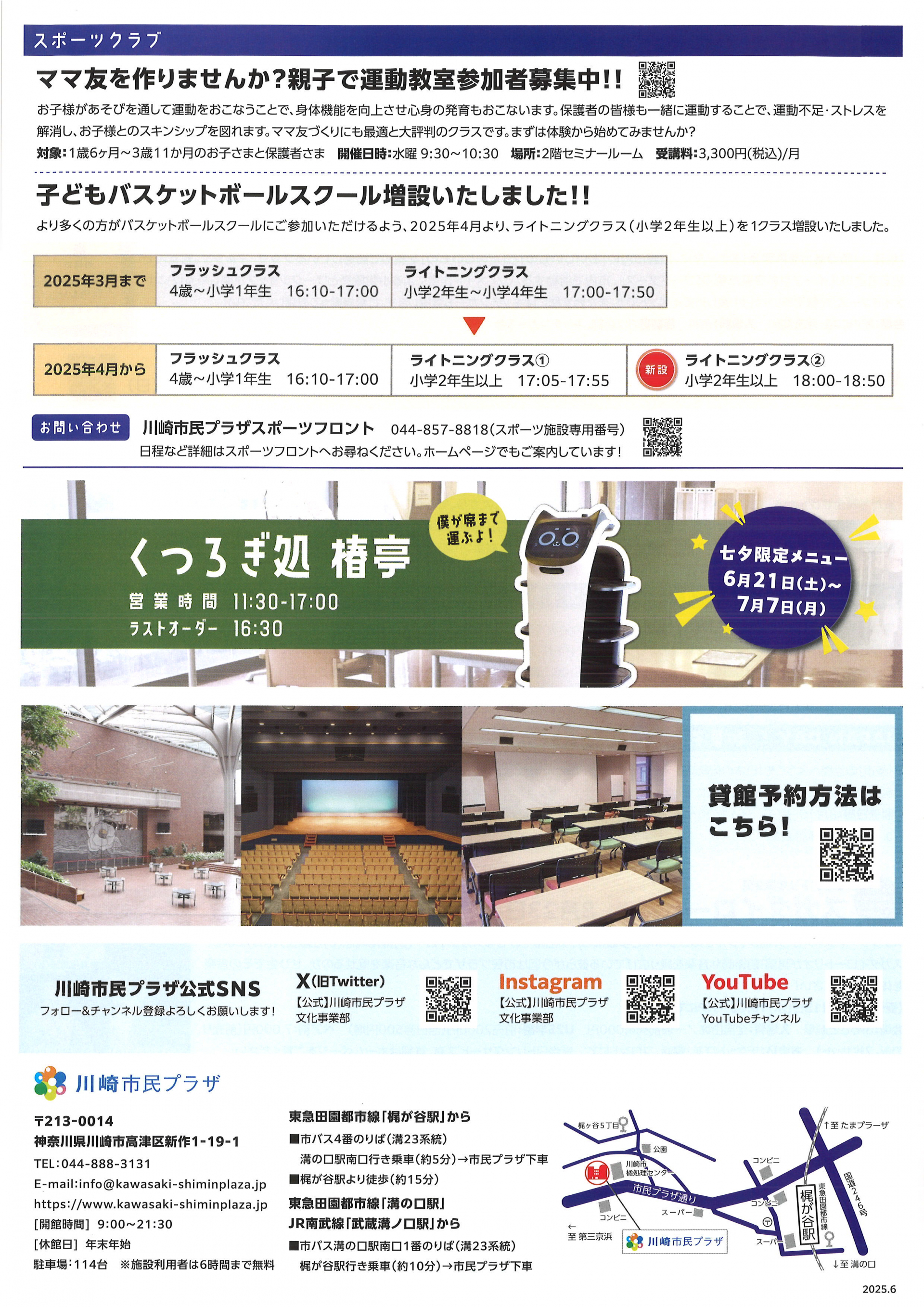 2025.06.27 お知らせ 【久末居宅】プラザだより 6月号。 Tweet シェアする プラザだより6月号です。 夏休み向けのイベントの他にも、和菓子作りやジャズライプもあります♪ 【久末居宅 S】 前の記事 2025.06.27 お知らせ 【久末居宅】おはよう!歌の広場。 次の記事 2025.06.27 お知らせ 【久末居宅】川崎市介護支援専門員連絡会総会。 一覧へ戻る