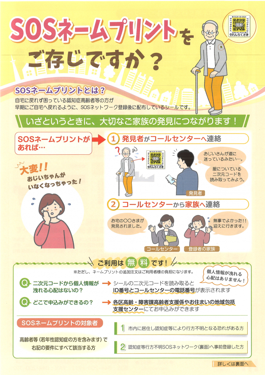 保護に協力する仕組みがあります。ネットワークに登録後、お渡しするSOSネームプリントを持ち物に貼付し、