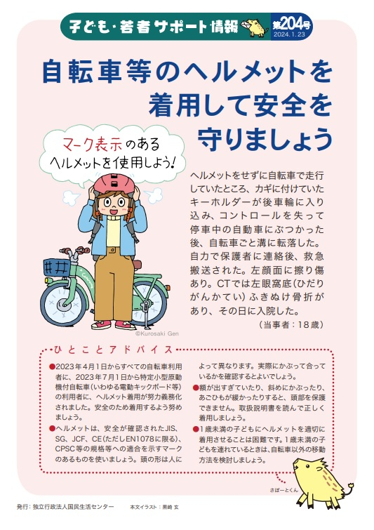 国民生活センターより、自転車乗車時のヘルメット着用についてのお知らせです。