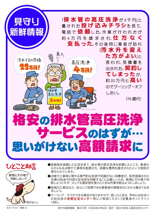 低価格を強調した広告を見て、排水管の高圧洗浄を依頼したところ、業者からさらなる点検や工事等を勧誘され、高額な費用を請求されたという相談が寄せられています。