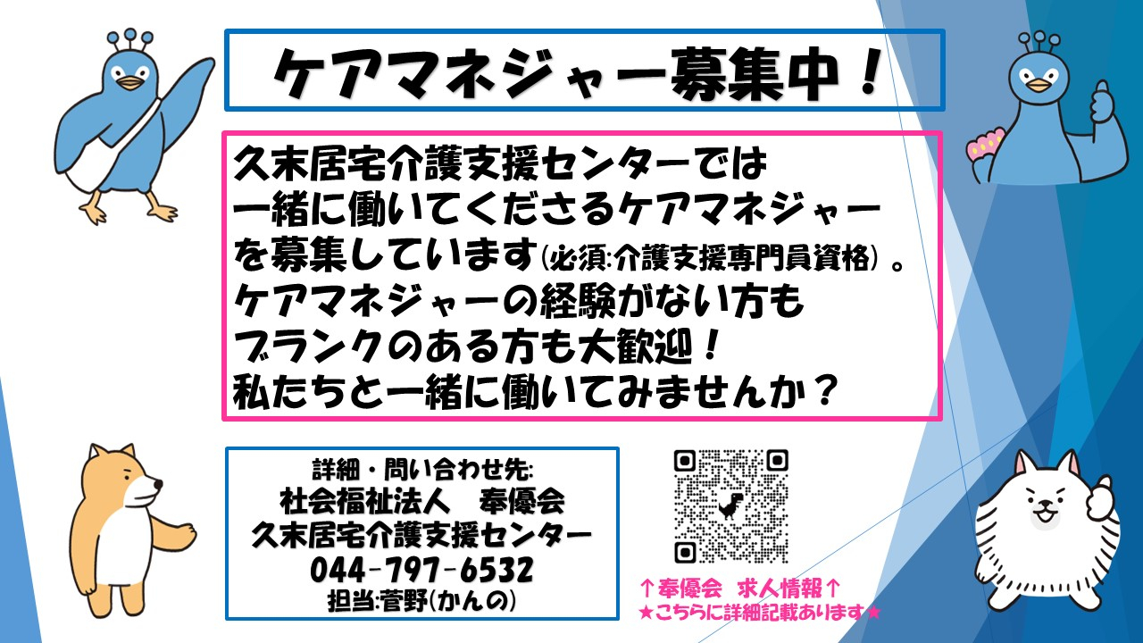 採用・ボランティア メッセージ わたしたちと一緒に働きましょう。 久末居宅介護支援センターではケアマネジャーを募集しています。 現在3名の女性ケアマネが在職しています。ご応募ぜひお待ちしております!! 求人情報 ボランティア