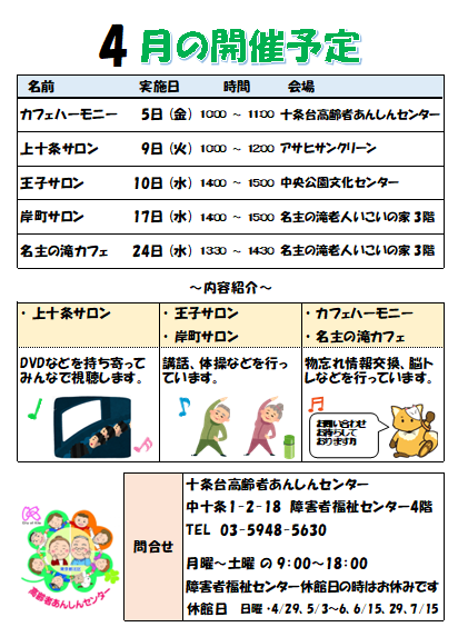 2024.04.02 お知らせ 【十条台包括】4月 開催予定 Tweet シェアする 4月の開催予定になります! 前の記事 2024.04.06 お知らせ 【十条台包括】4月若年性認知症カフェ 次の記事 2024.04.01 お知らせ 家族介護者教室 一覧へ戻る