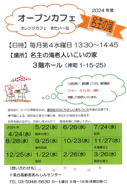 2024.06.08 お知らせ 【十条台包括】名主の滝オープンカフェからのお知らせ Tweet シェアする 6月26日(水)開催の名主の滝オープンカフェからのお知らせです! 今月から15分時間を延長しての開催となります。 お時間がある方はお気軽に参加下さい♬ 【十条台包括】 前の記事 2024.06.11 お知らせ 【十条台包括】自主グループ交流会 次の記事 2024.06.08 お知らせ 【十条台包括】6月若年性認知症カフェ 一覧へ戻る