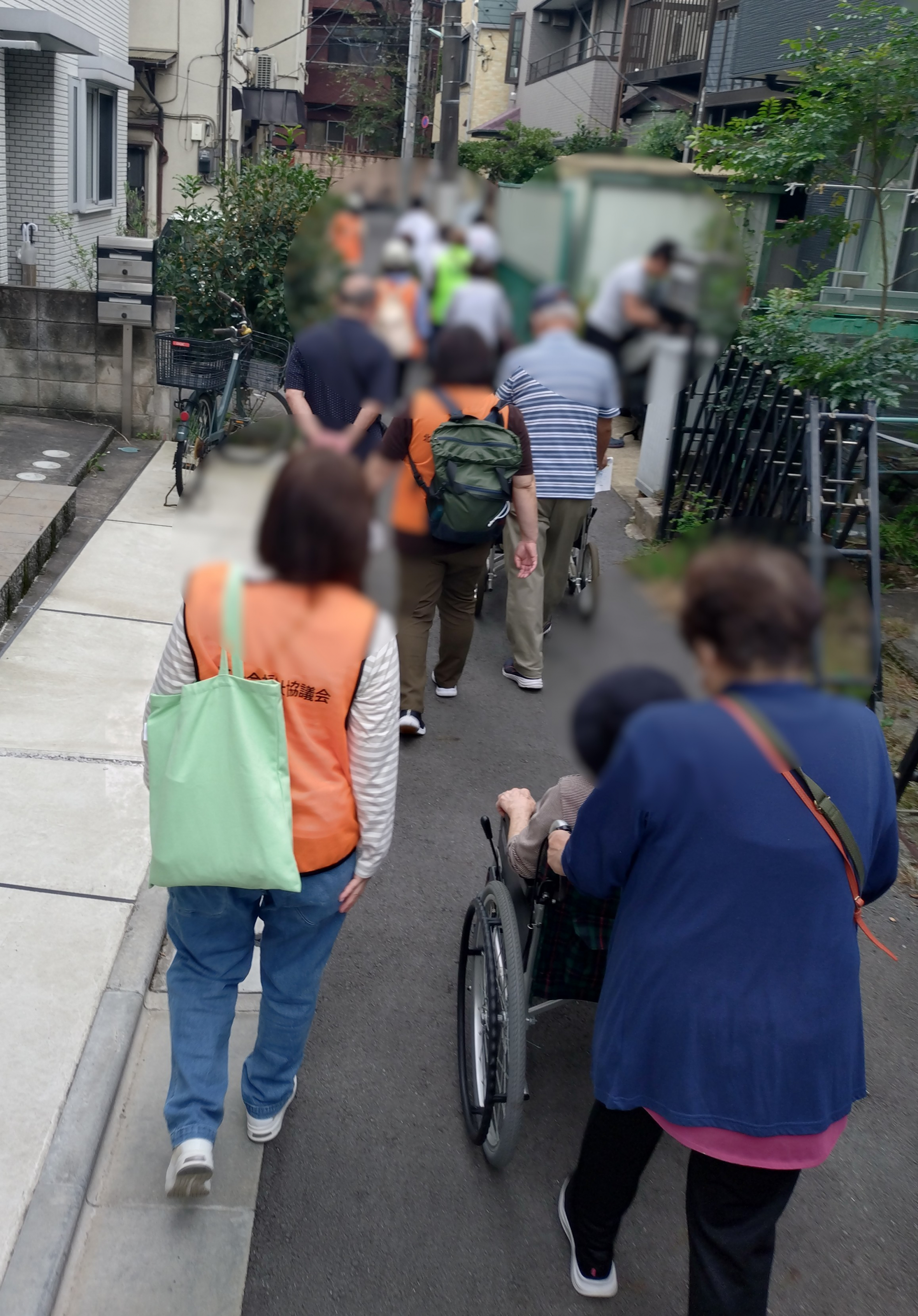社会福祉協議会の方から、車椅子の使い方を教えていただき、名主の滝老人いこいの家まで走行練習を行いました。