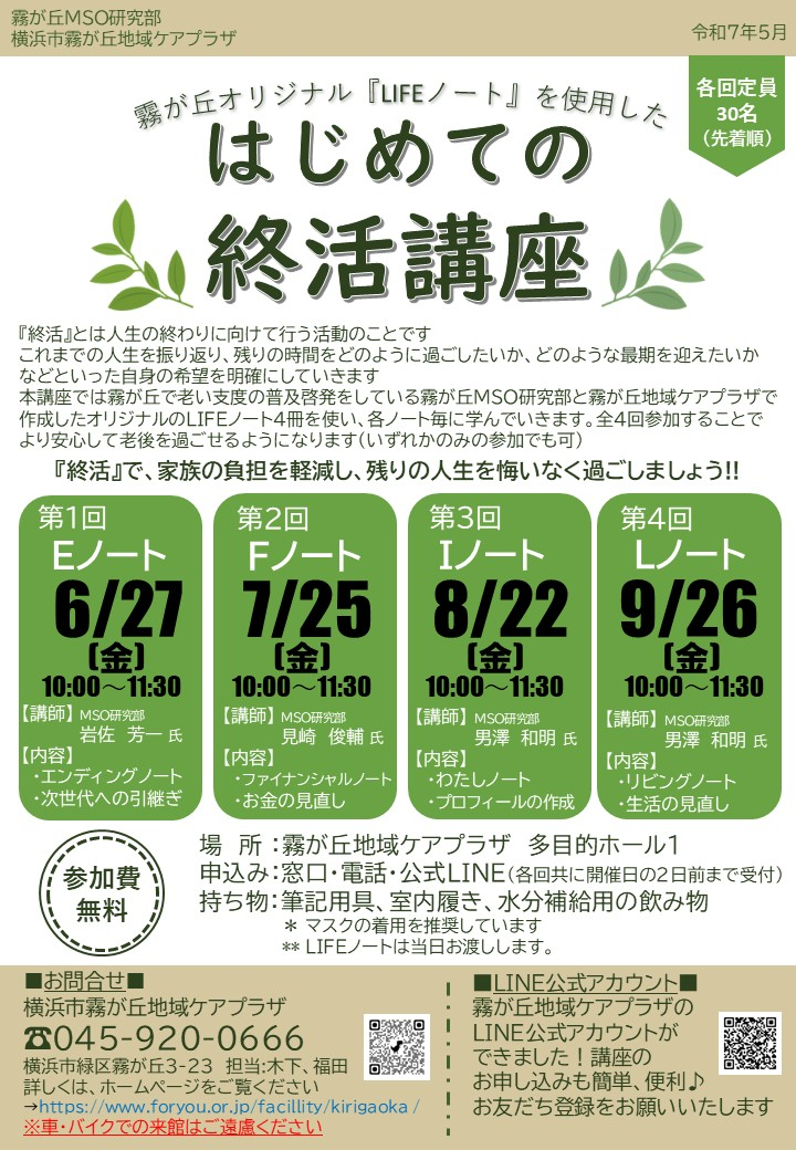 来月から霧が丘地域ケアプラザでは『はじめての終活講座』と題して