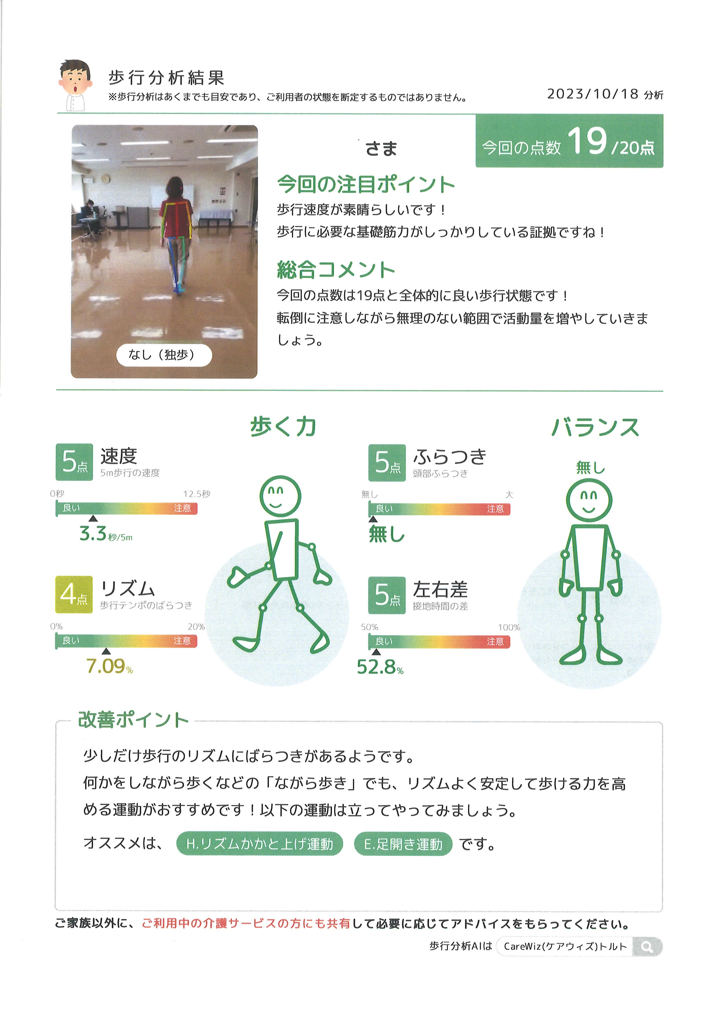 この歩行分析では歩行状態の分析だけでなく、歩行改善のアドバイスもありますので、