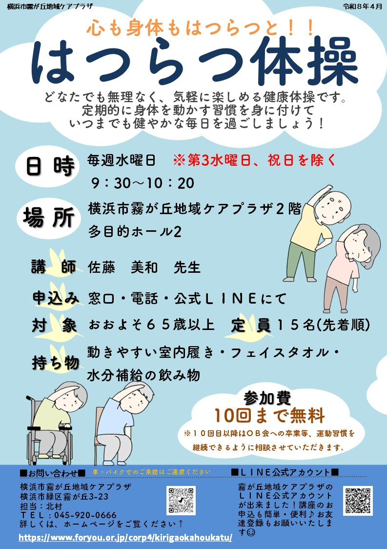 霧が丘地域ケアプラザでは、今年度も「はつらつ体操」を開催いたします。