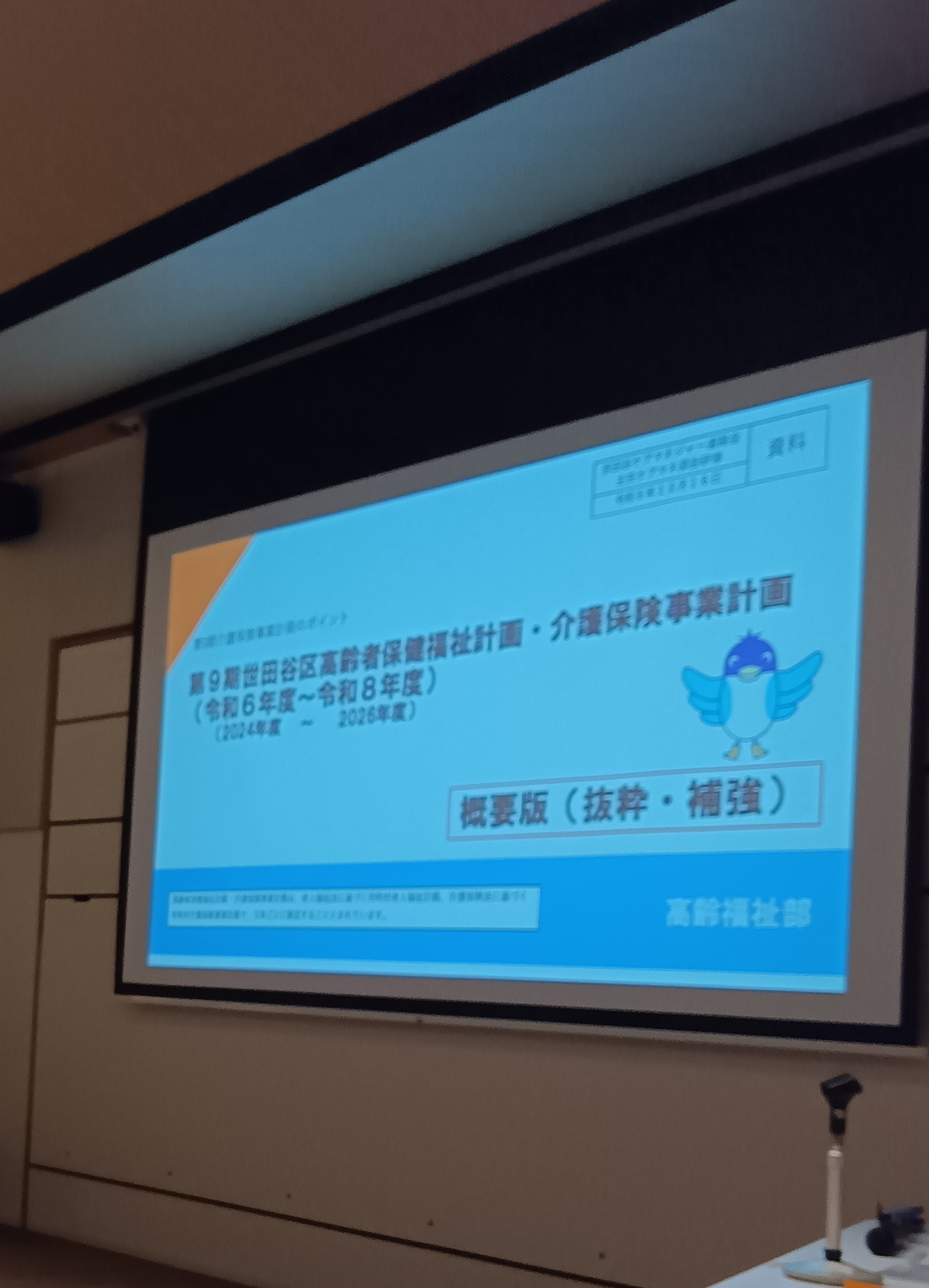 介護保険課事業者支援担当よりケアマネジメント基本方針について、高齢福祉課計画担当より世田谷区第9期介護保険事業計画のポイントについてのご説明いただきました。