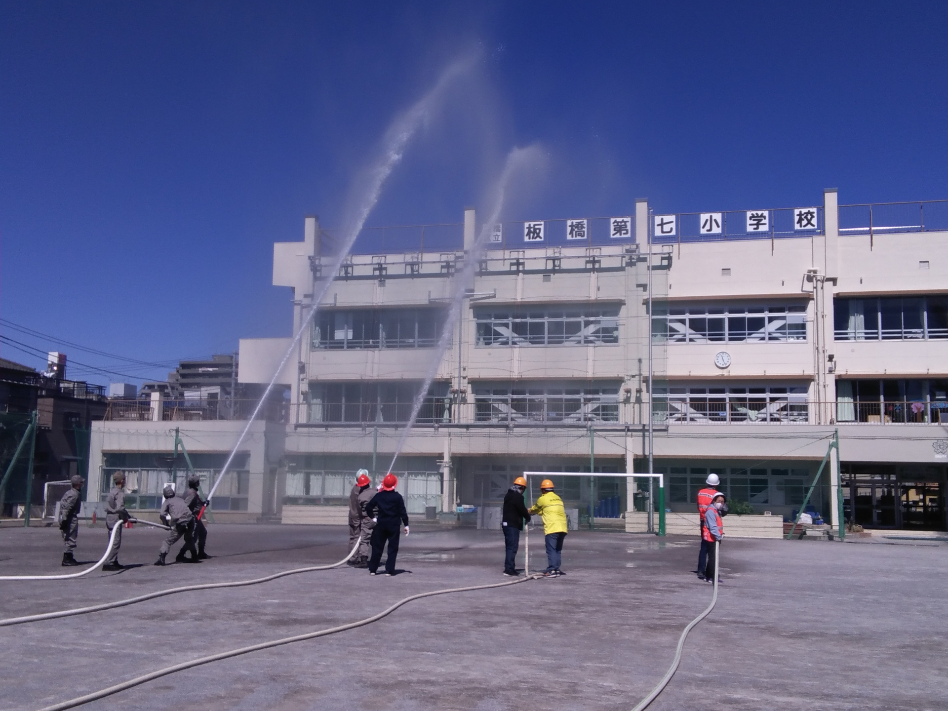 板橋第7小学校へ到着後、人数確認・報告を行い、各ポイントに分かれて訓練を行いました。
