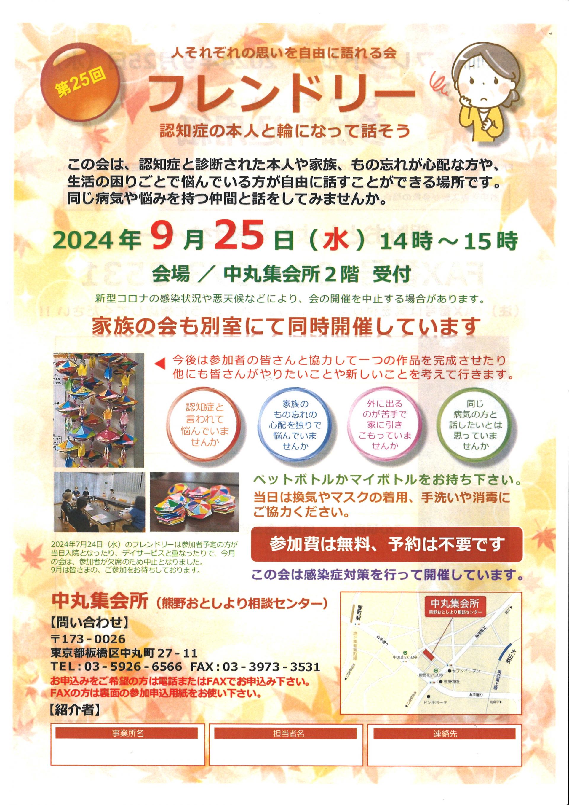 【熊野包括】認知症の本人と輪になって話そう「フレンドリー」9月のお知らせです。