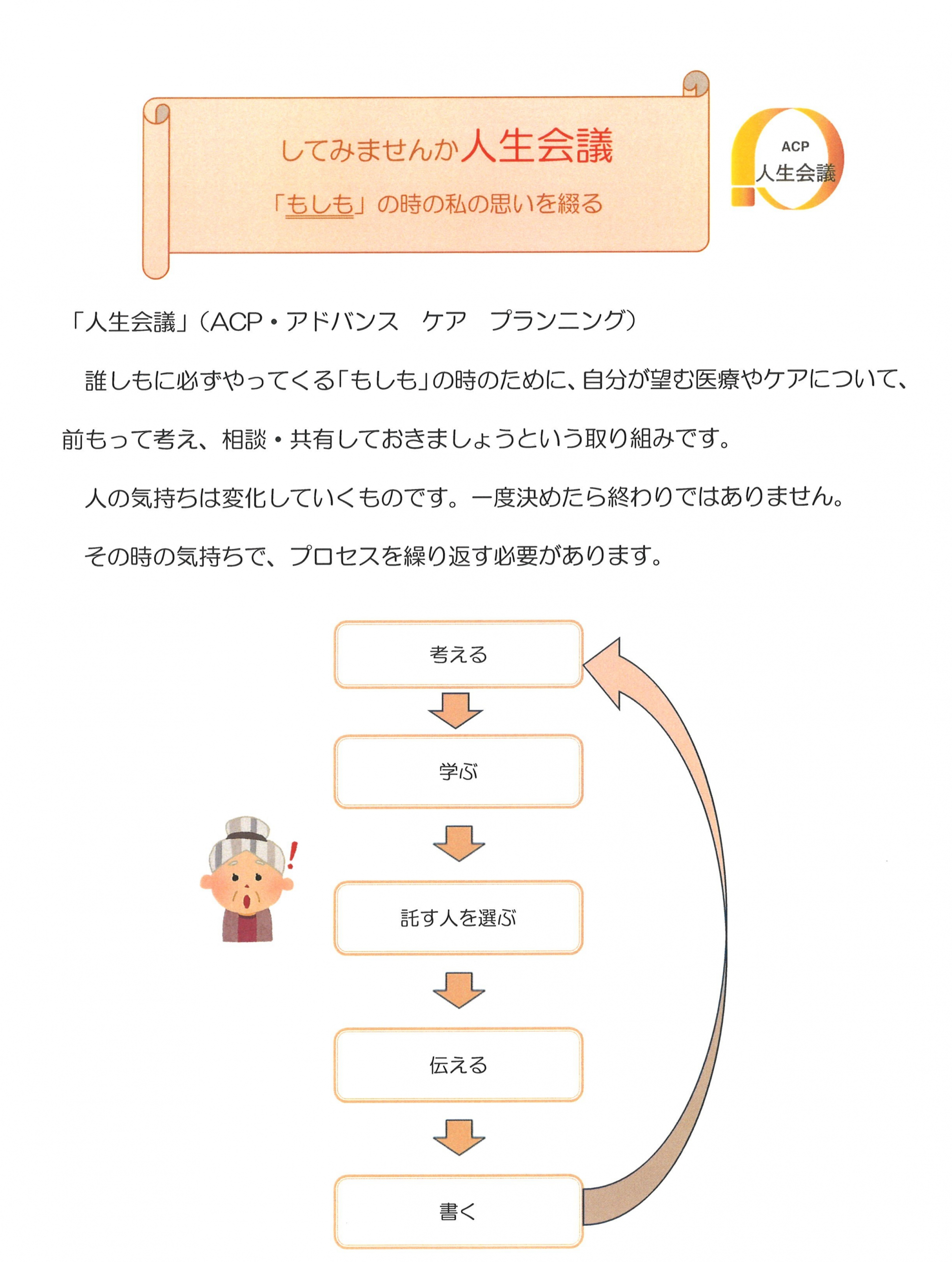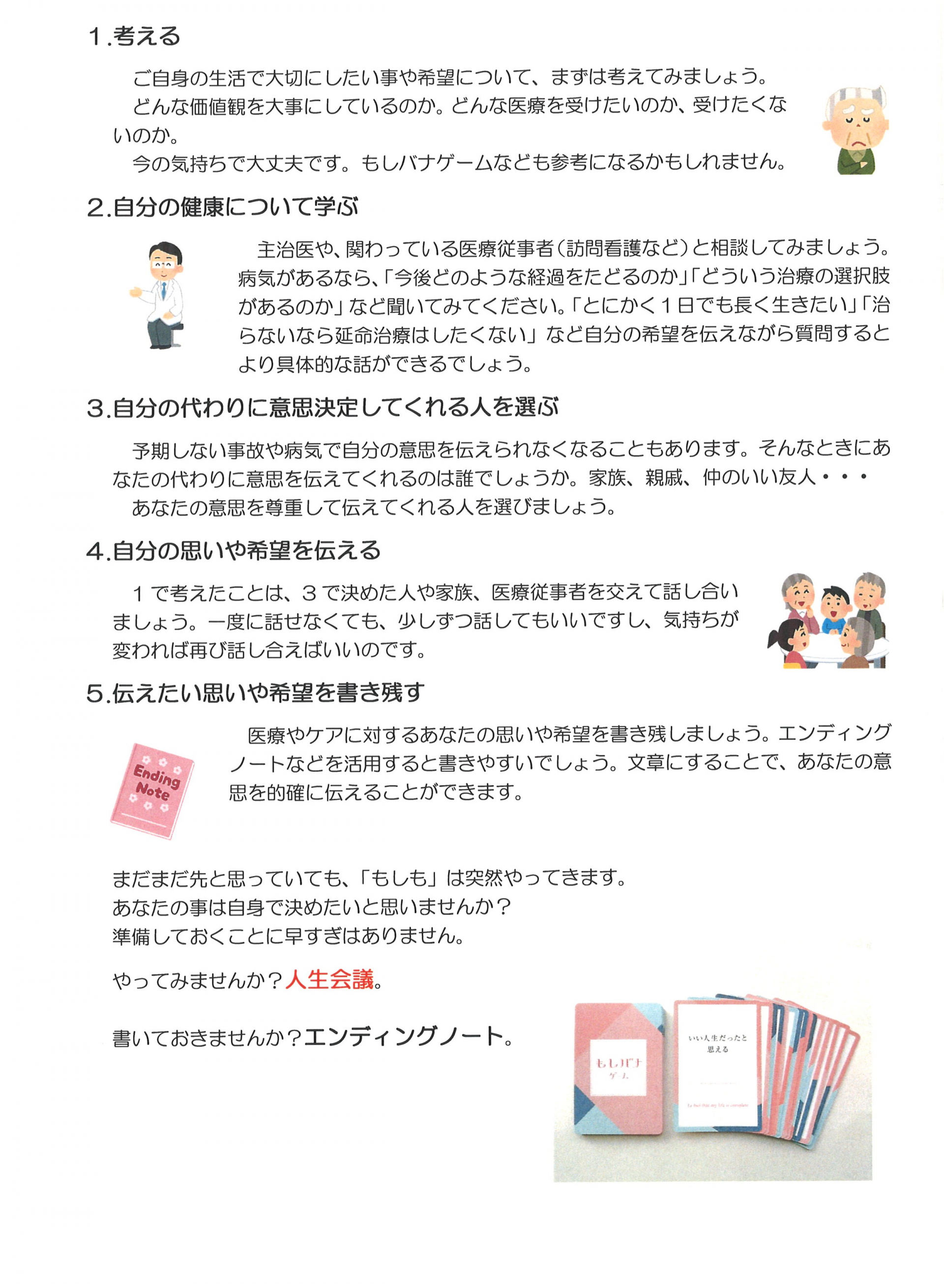 2024.01.10 ニュース 【熊野包括】人生会議してみませんか Tweet シェアする 本年は年の初めから、いろいろな災害が重なり、先の事を考える機会が多かったと思います。 こんなときだからこそ、考えてみませんか?人生会議。 #人生会議 #ACP #もしバナゲーム #もしものときのために 前の記事 2024.01.12 ニュース 【熊野包括】令和5年度 第5回 仲町・熊野主任ケアマネの会開催について 次の記事 2024.01.09 ニュース 【熊野包括】令和5年12月分介護保険伝送手続き 終了しました 一覧へ戻る