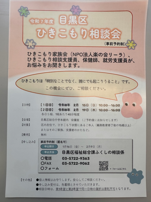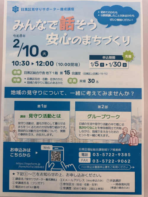 2026.01.26 【目黒中央包括】羽根木公園の梅が咲いています~🌺 お知らせ 2026.01.26 【目黒中央包括】実績報告について お知らせ 2026.01.26 【目黒区中央包括】祐天寺が熱い! お知らせ 2026.01.26 【目黒区中央包括】認知症 安心ガイドブック お知らせ 2026.01.26 【目黒区中央包括】春に向けて居場所探し! お知らせ 2026.01.26 【目黒区中央包括】めぐろフレイル予防フェアのご案内 お知らせ 2026.01.26 【目黒区中央包括】Dカフェへようこそ! お知らせ 2026.01.26 【目黒中央包括】上目黒いこいの家相談出張相談会 行いました。 活動報告 2026.01.26 【目黒中央包括】防災士フォローアップ研修に参加しました。 活動報告 2026.01.26 【目黒中央包括】みんなで話そう 安心のまちづくり お知らせ 2026.01.24 【目黒区中央包括】ひきこもり相談会のお知らせ お知らせ 2026.01.15 サービス事業所の皆様へ お知らせ 2026.01.13 【目黒中央包括】世田谷ボロ市に行ってきました。 活動報告 2026.01.13 【目黒中央包括】上目黒いこいの家相談会行います お知らせ 2026.01.06 【目黒中央包括】目黒区中央地区のおすすめスポット:十日森稲荷神社 活動報告 1 2 3 … 31